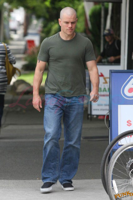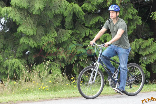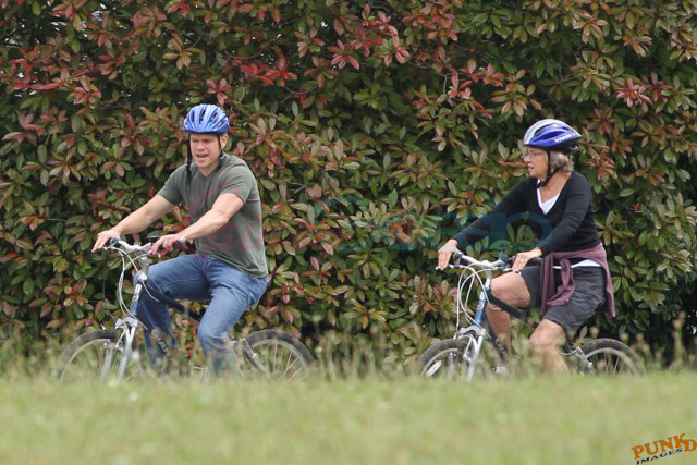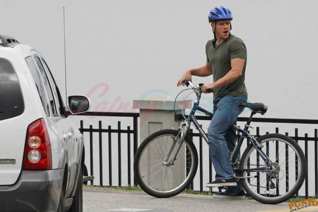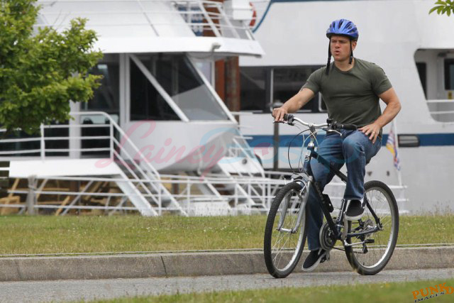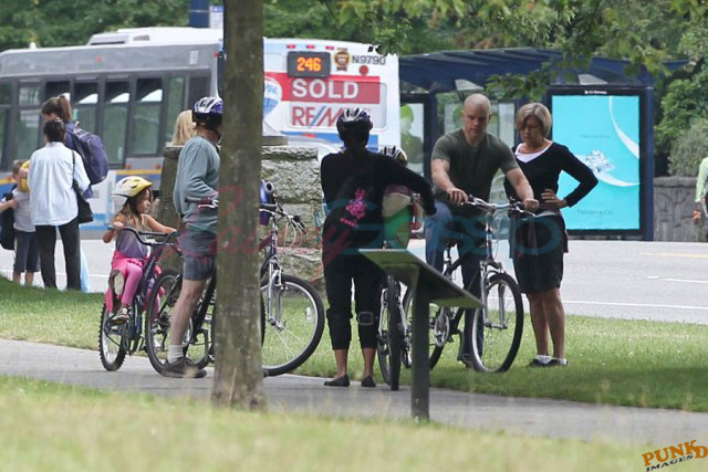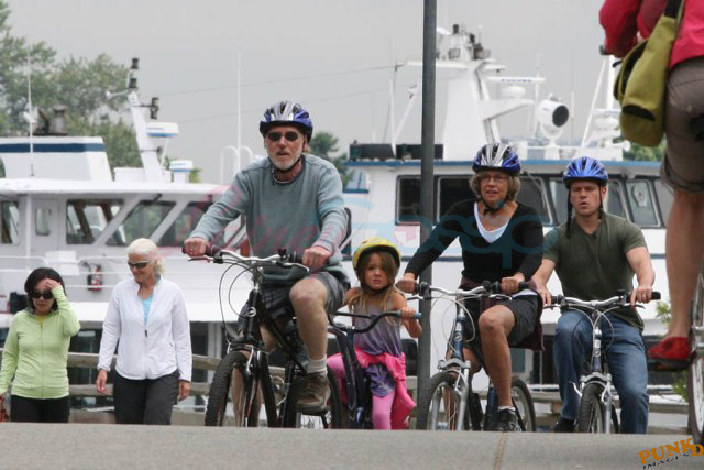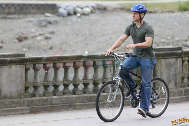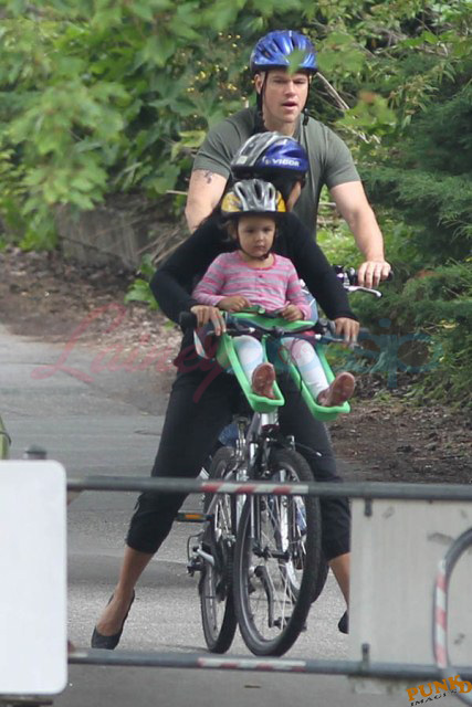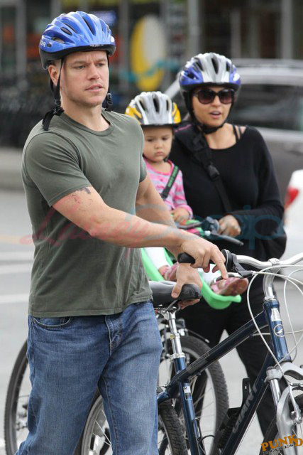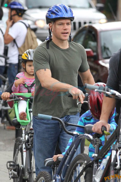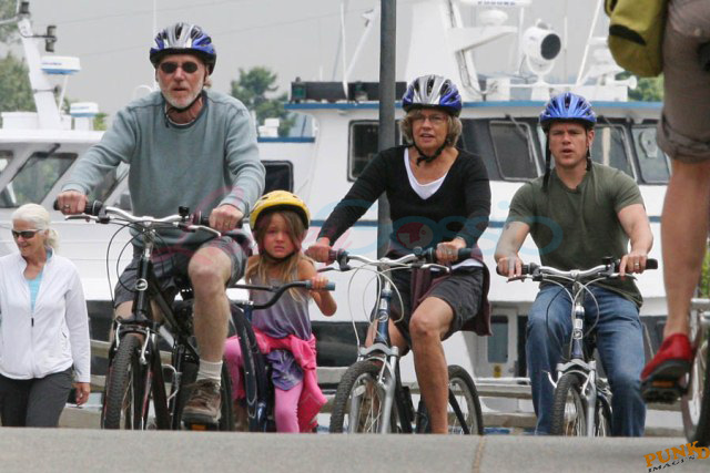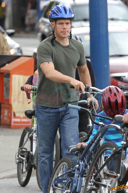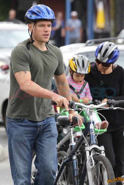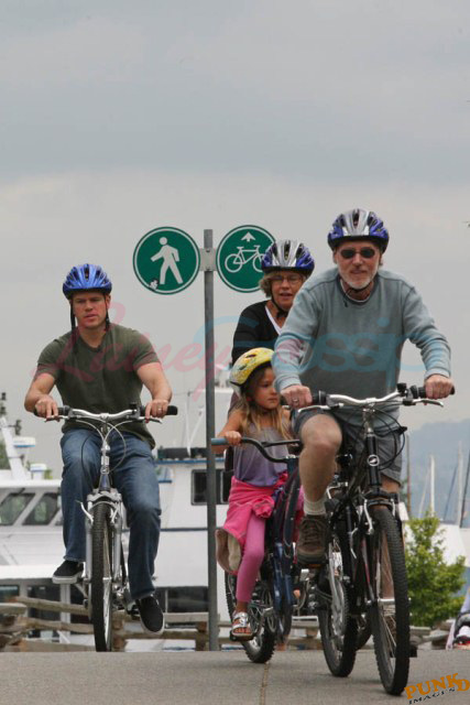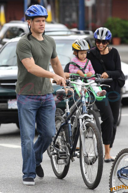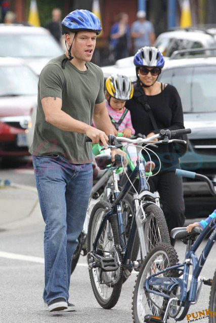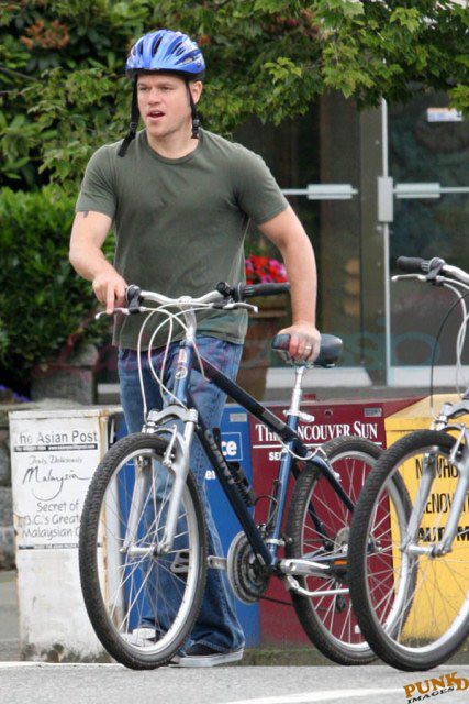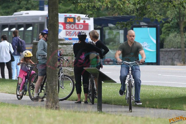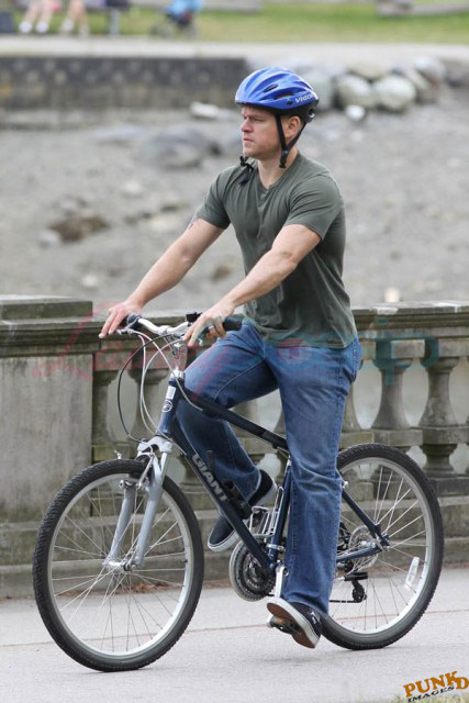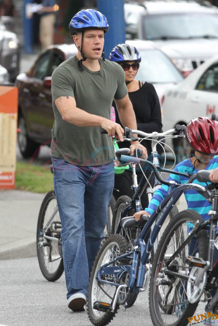 Matt Damon’s been in Vancouver the last few weeks shooting a movie. He was spotted yesterday, without hair, riding along the seawall with his wife and children and other family members. Some people don’t so great bald. He doesn’t look bad at all bald. In fact, it makes him look a lot younger. Look at him in the helmet. Like Good Will Hunting again, right?
