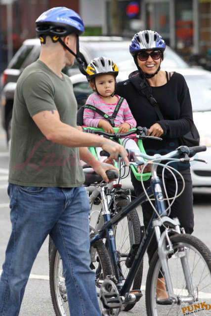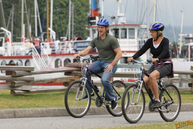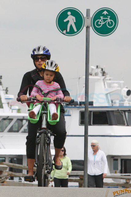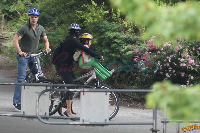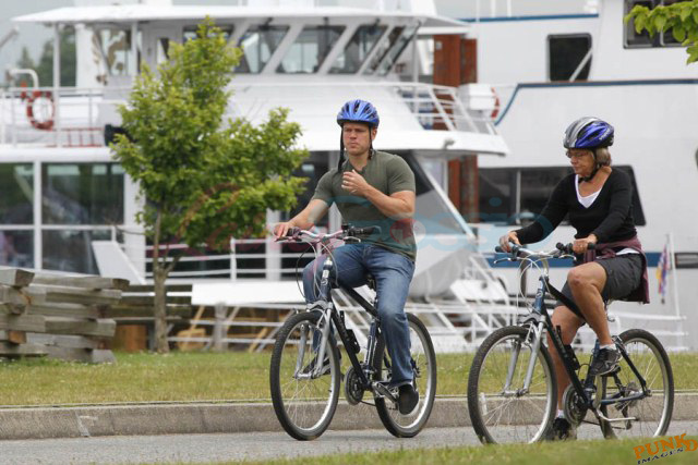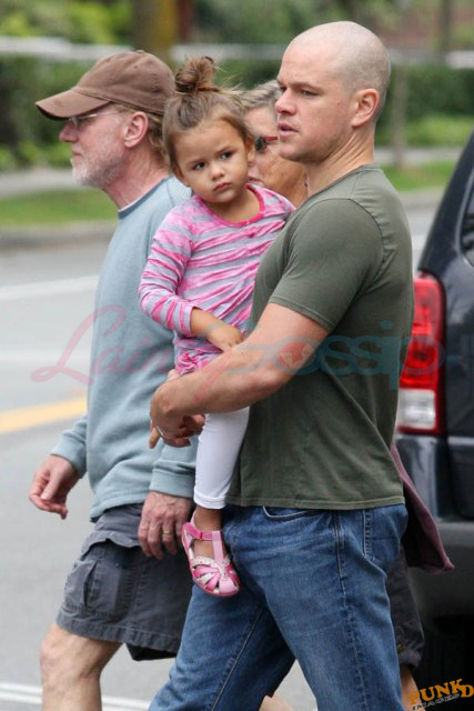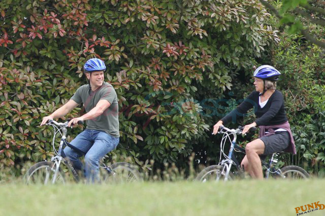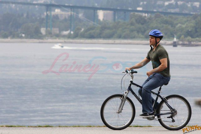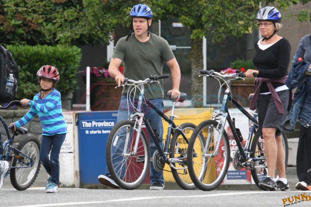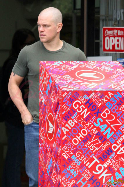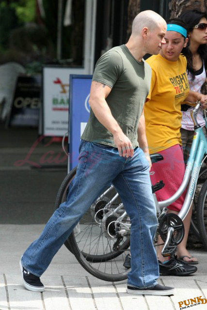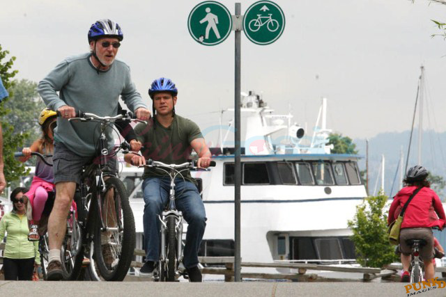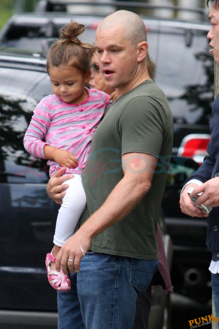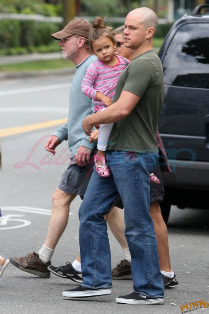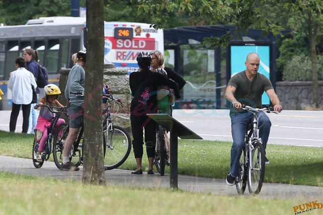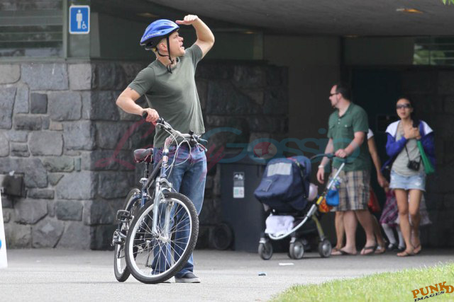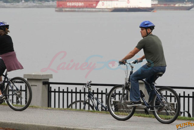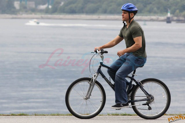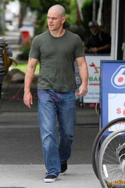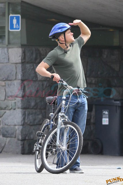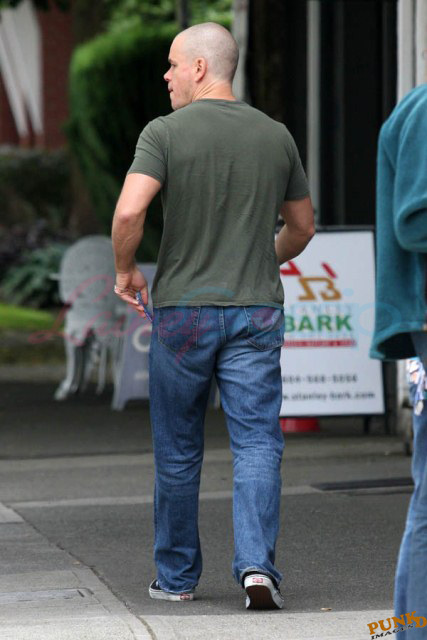 Matt Damon’s been in Vancouver the last few weeks shooting a movie. He was spotted yesterday, without hair, riding along the seawall with his wife and children and other family members. Some people don’t so great bald. He doesn’t look bad at all bald. In fact, it makes him look a lot younger. Look at him in the helmet. Like Good Will Hunting again, right?