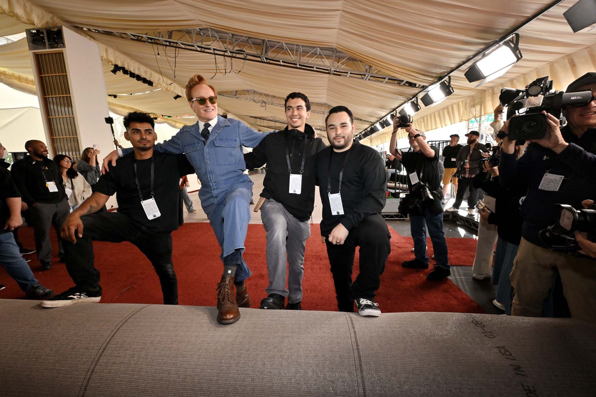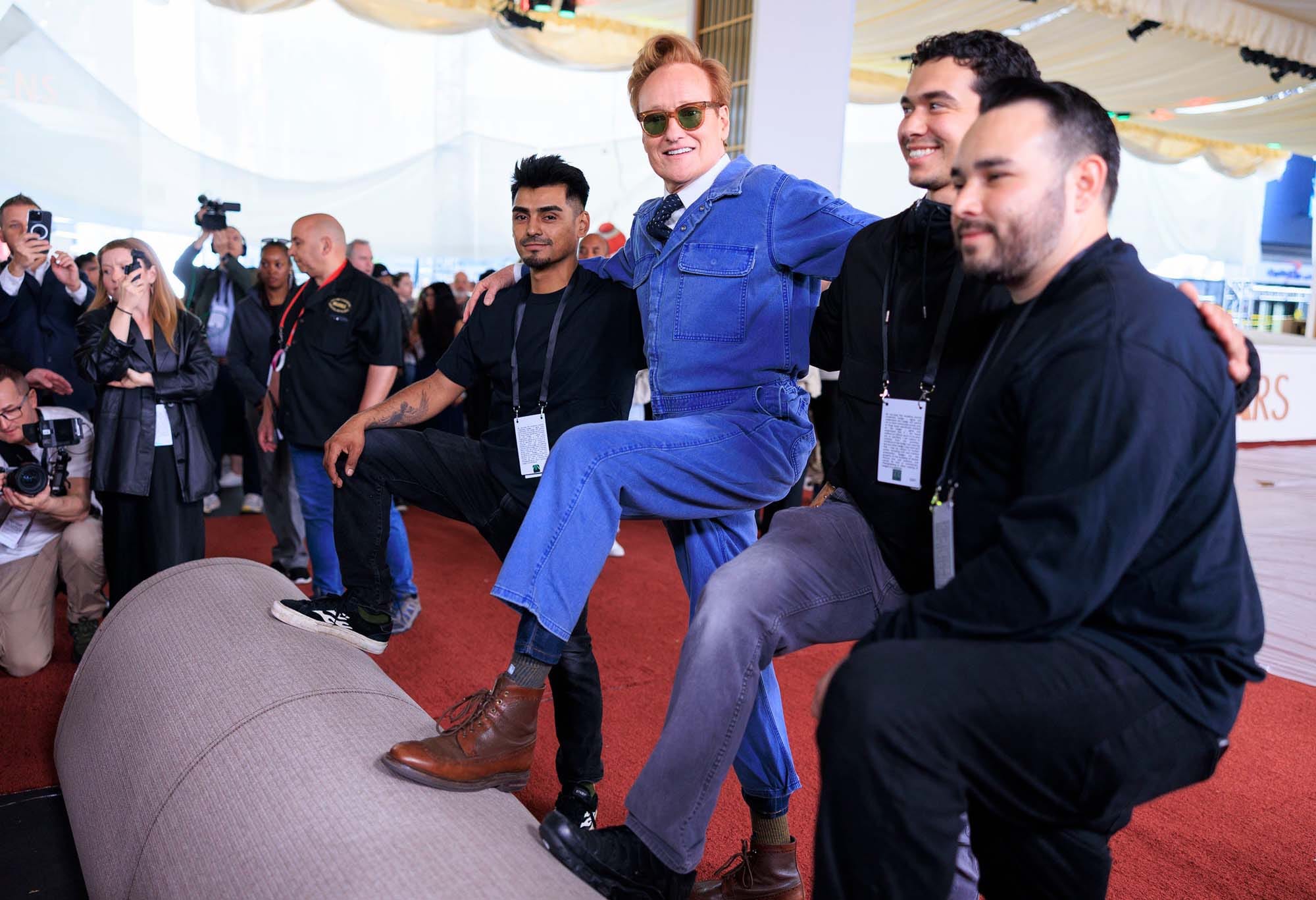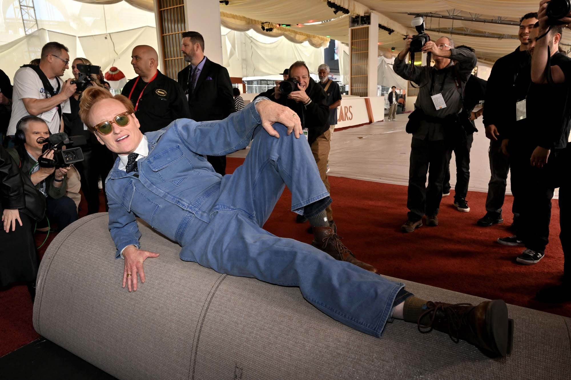 Yesterday, Conan O’Brien, who is returning for his second stint as host of the Oscars, rolled out the red carpet at the Dolby Theater. He did so while wearing denim coveralls, a collared shirt, and a tie. This is a look that like, six people maximum, in the entire world, can pull off. Conan is one of them.