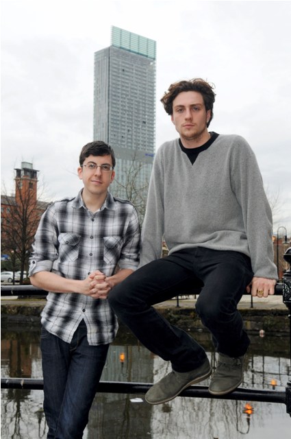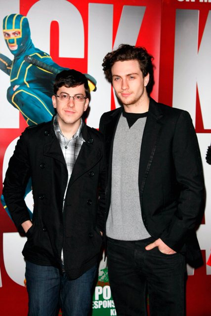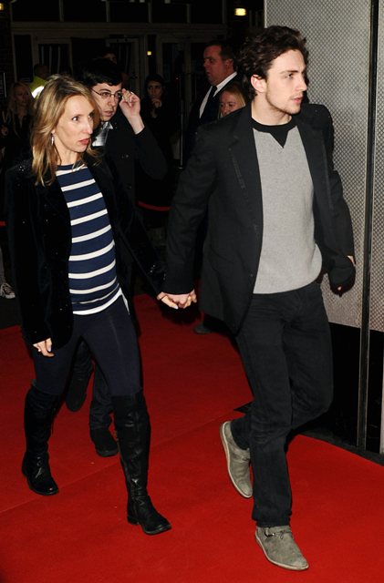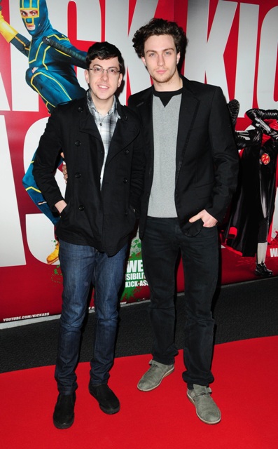 It feels that way when you’re obsessed with something. In my case, right now, it’s Aaron Johnson, the 19 year old “Next” from England, and his 43 year old pregnant-with-their-child fiancée Sam Taylor-Wood. Click here for a refresher. Aaron is also starring opposite Carey Mulligan in The Greatest, and he showed up in Manchester yesterday for Kick-Ass with Christopher Mintz-Plasse. As you can see, Sam is travelling with him. Sam is always with him. Or he’s always with her. I f-cking love it.