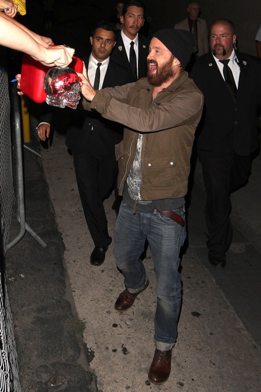 He appeared on Jimmy Kimmel last night, showing off his secret talent of discerning a dog’s sex just by petting him/her (am I naïve to think that this wasn’t rigged?) and talks about his fan encounters. As we know, Aaron goes out of his way to greet fans – and now it’s biting him in the ass. Remember that tour bus outside his house? He now has people regularly camping out on his doorstep. He did a screening in Boise and did a treasure hunt for tickets – people were tackled to the ground in what sounded like mayhem. Sometimes he asks for people to tweet their phone number so he can call them, and then he spends most of the conversation convincing the fan that he is actually Aaron. And then they scream.