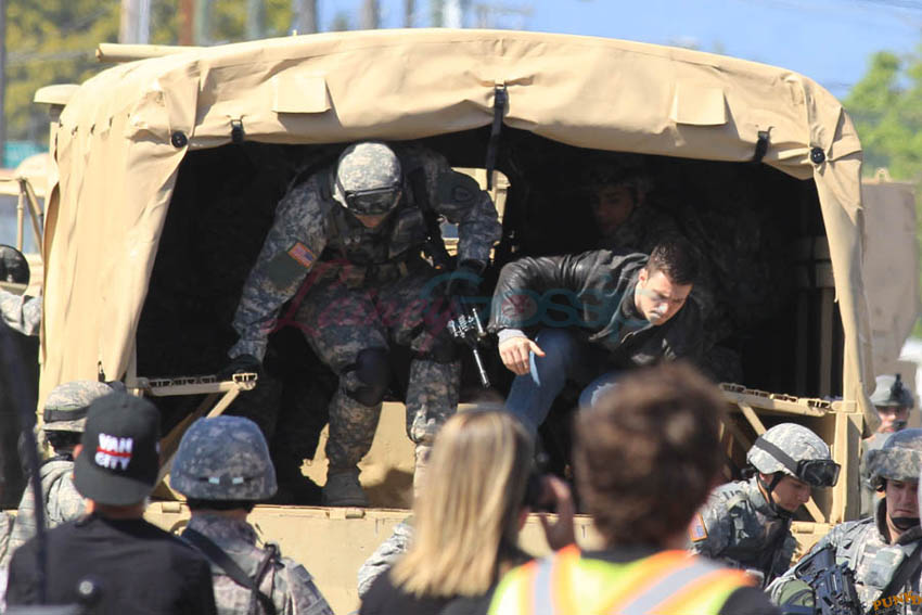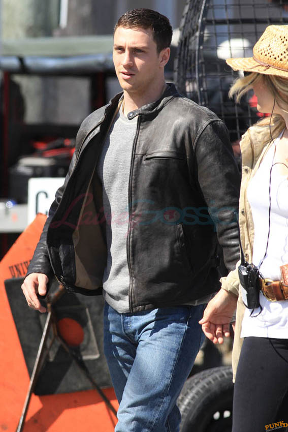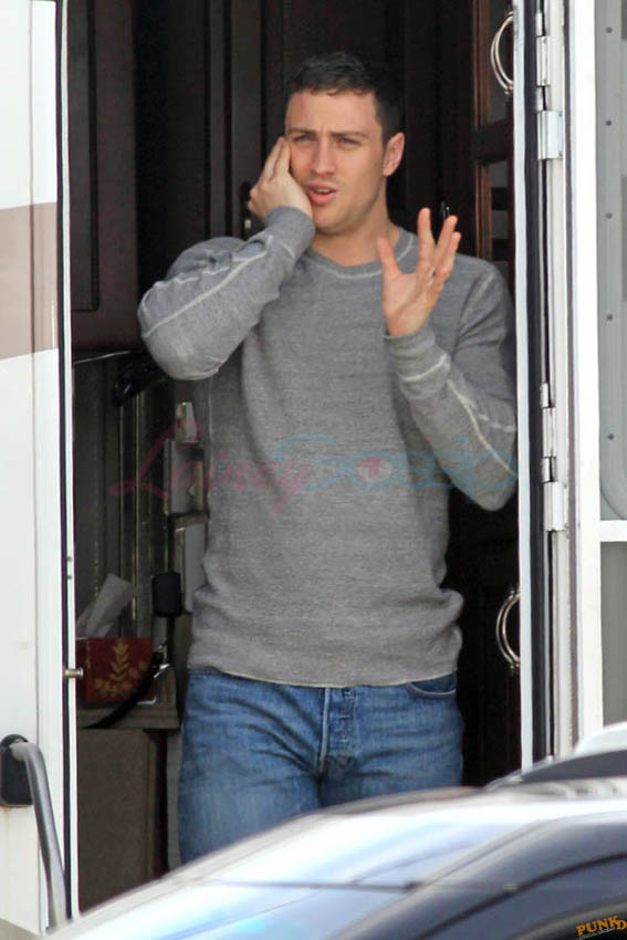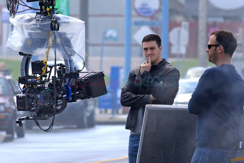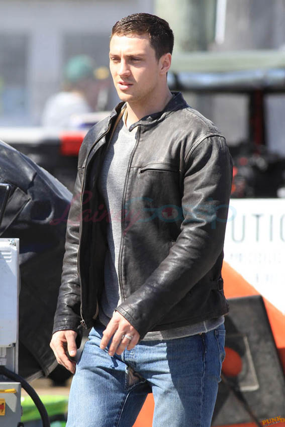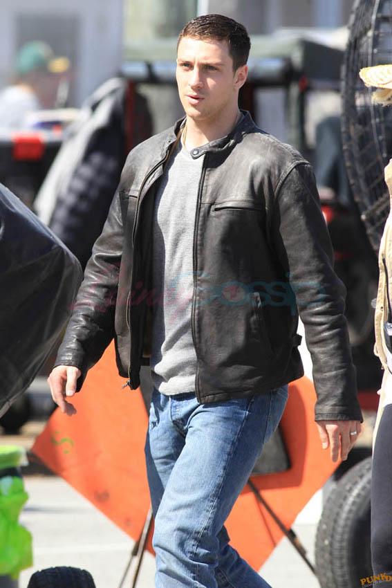 Aaron Taylor-Johnson in Steveston (just outside Vancouver) today shooting Godzilla. As you can see, he’s muscled up for the role. There’s a little Channing Tatum going on here, non? And a Hulk in his pants. Oh stop. I mean the rip, see? The rip at the crotch?