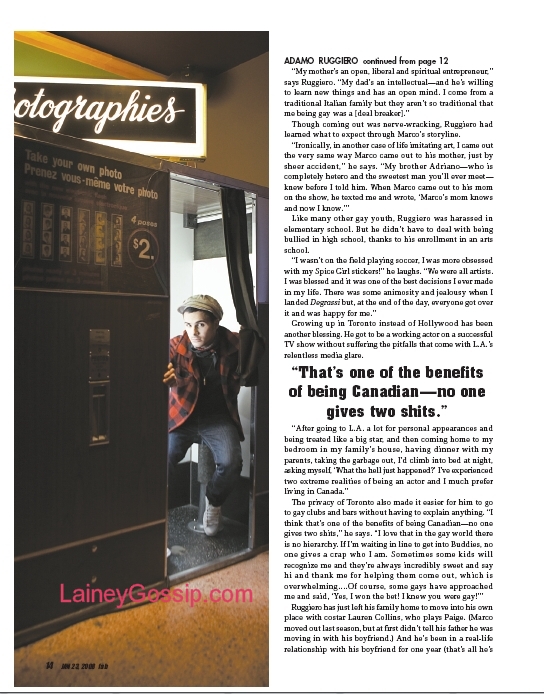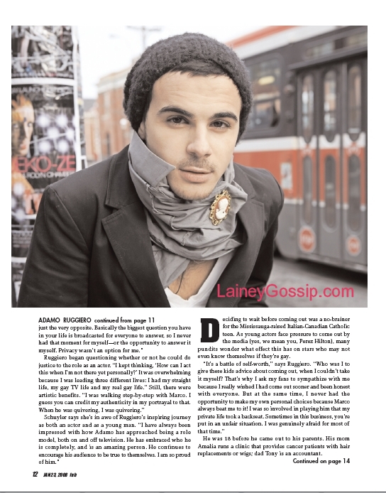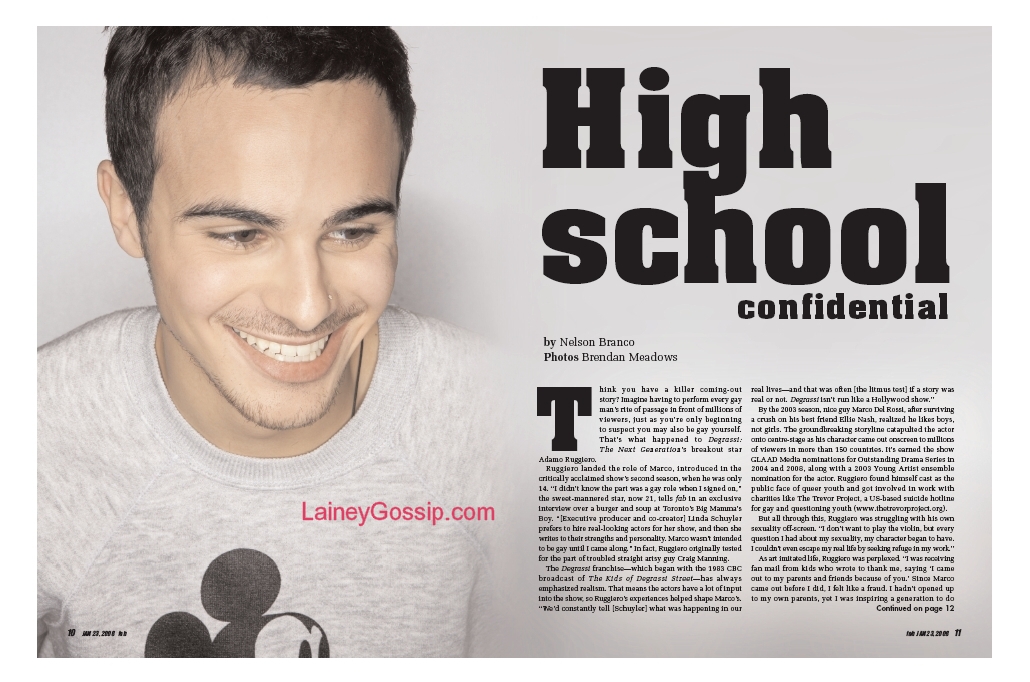 As revealed exclusively on eTalk last week, Degrassi star Adamo Ruggiero is gay and has decided to come out. Adamo tells his story to Nelson Branco in the new issue of Fab, explaining how he came to terms with his sexuality, what he struggled with, and the peace he found afterwards.
