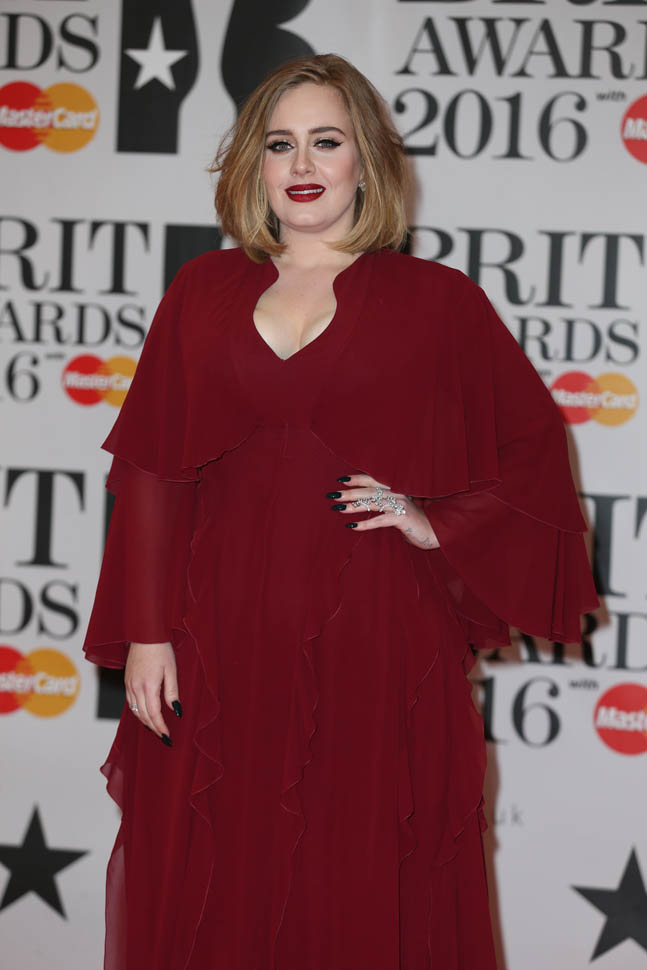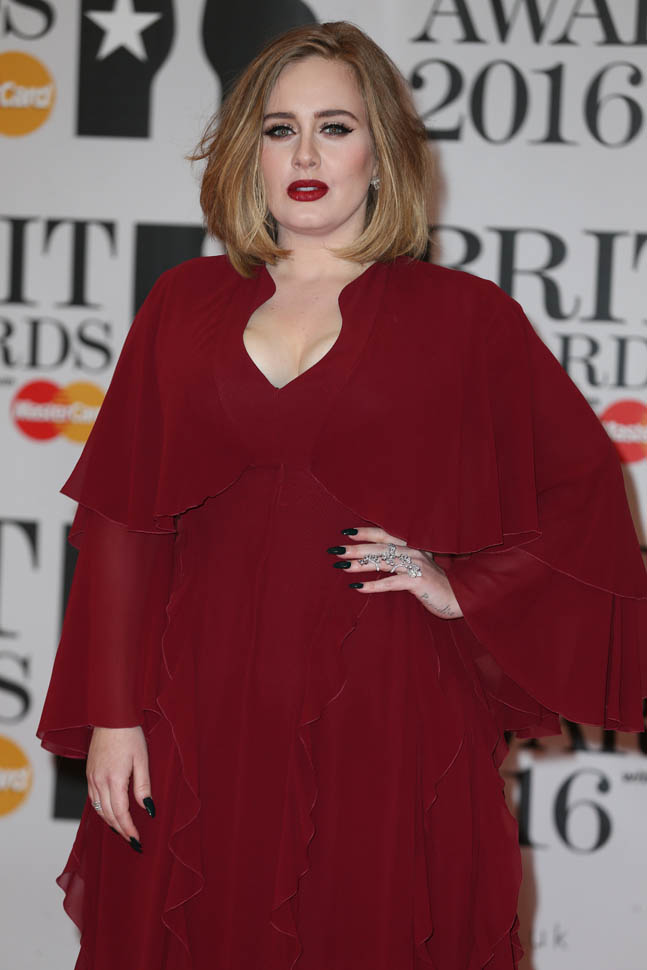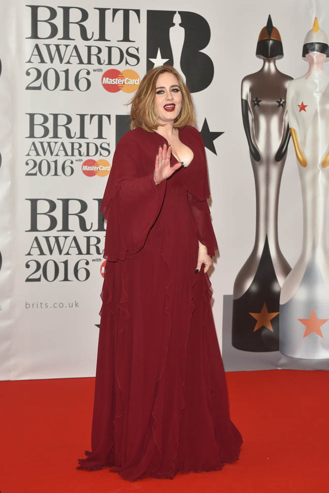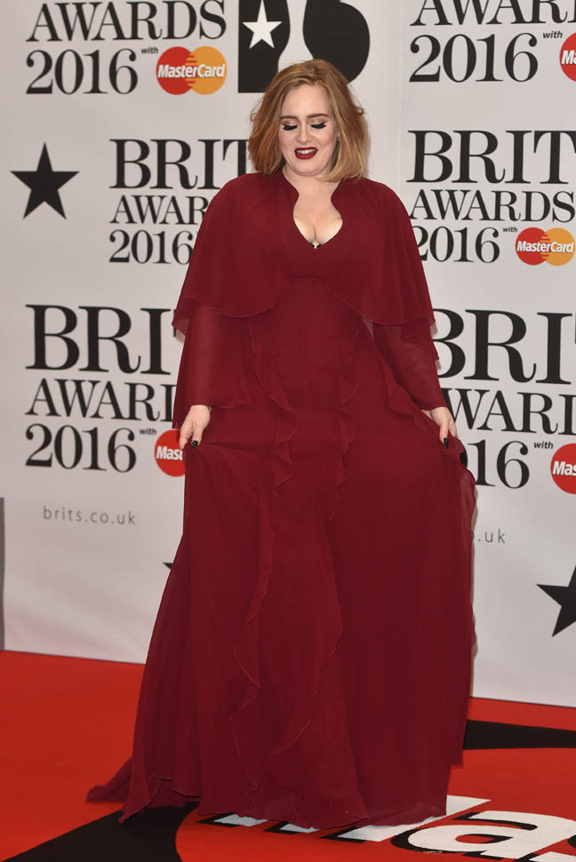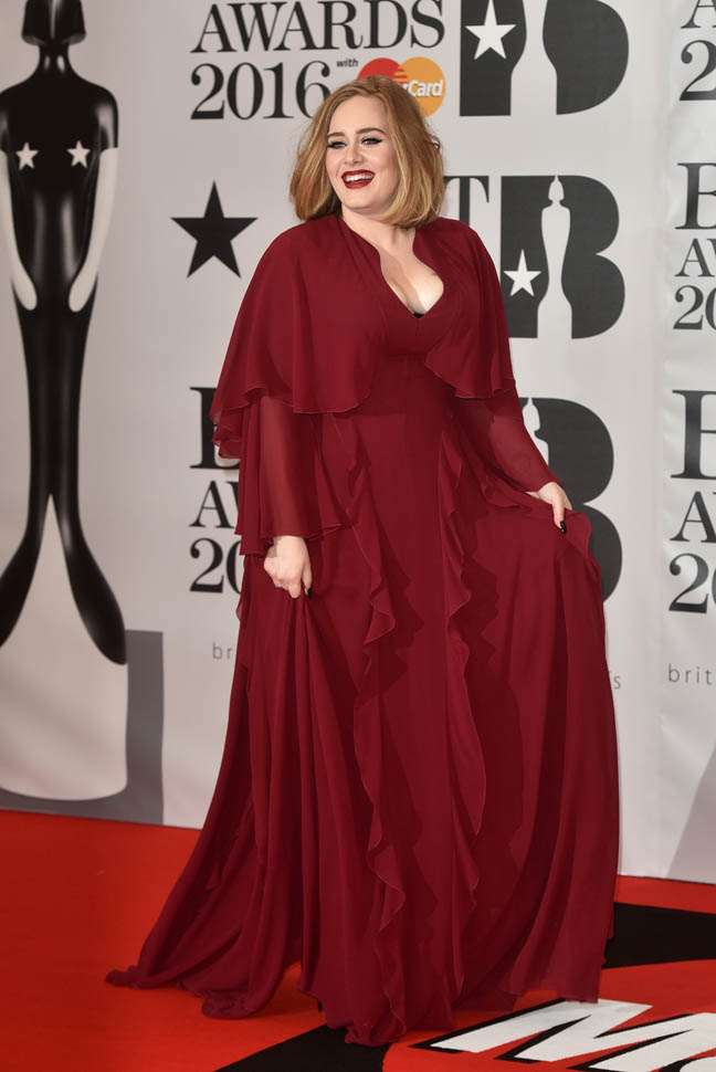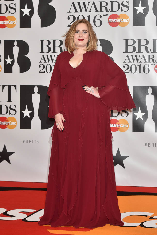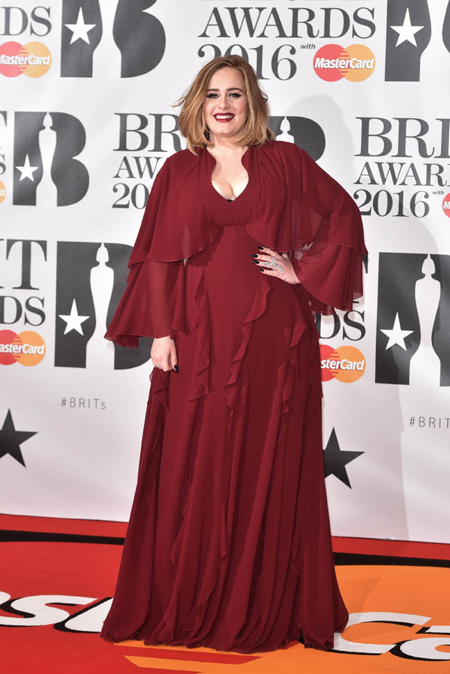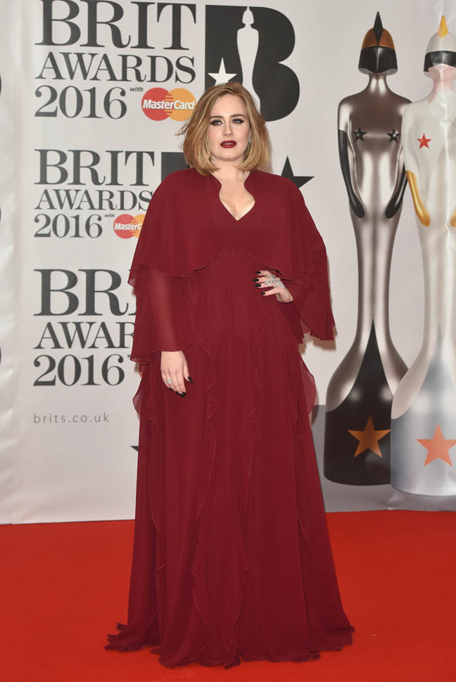 It’s not just not black either. It’s not even close to black, like grey or midnight blue. It’s far, far, far away from black. It’s a warm, earthy red. Which she wore for her performance at the Grammys, yes, but a carpet red on Adele is not a usual occurrence. With a matching lip. And, oh my God, that hair.
