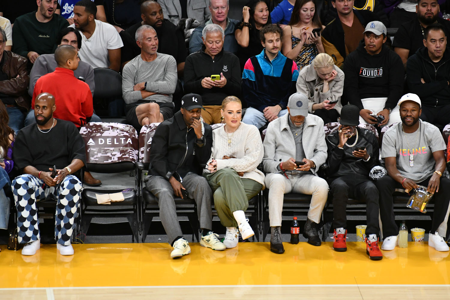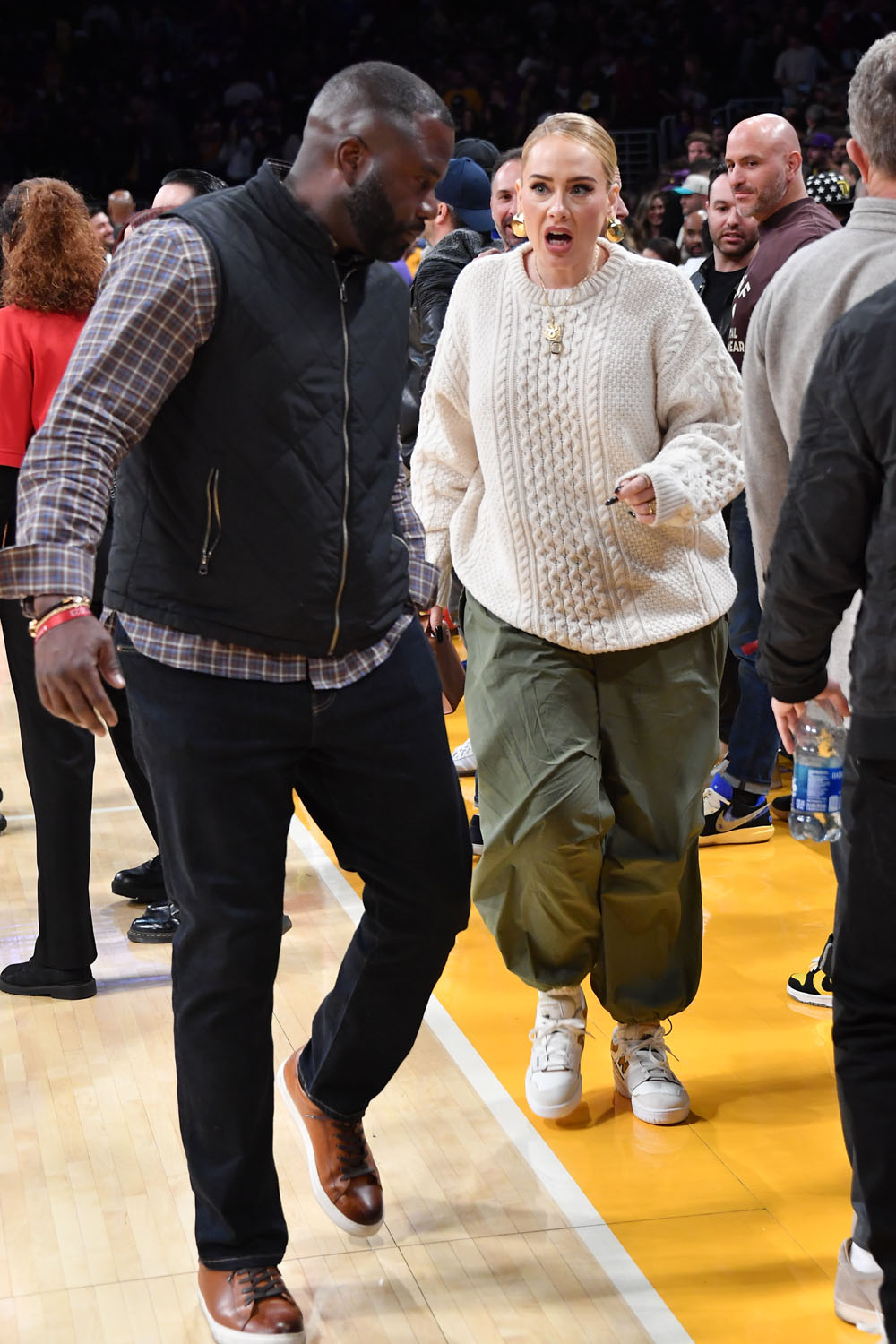Two Brits at the Lakers game last night, let’s start with Adele. She’s been making headlines this week because she was at her good friend Alan Carr’s show the other day and, according to DeuxMoi, at a point in the performance, when Alan asks the audience if there was anyone who recently got married Adele shouted out, “I did”. And of course there’s that big ass ring on her finger.