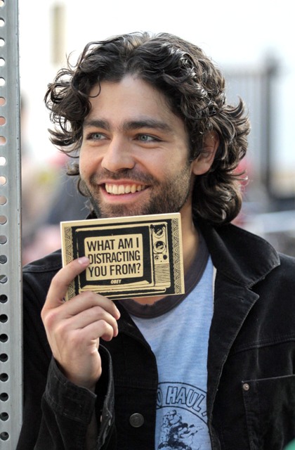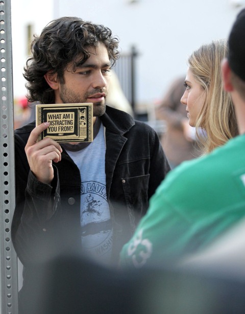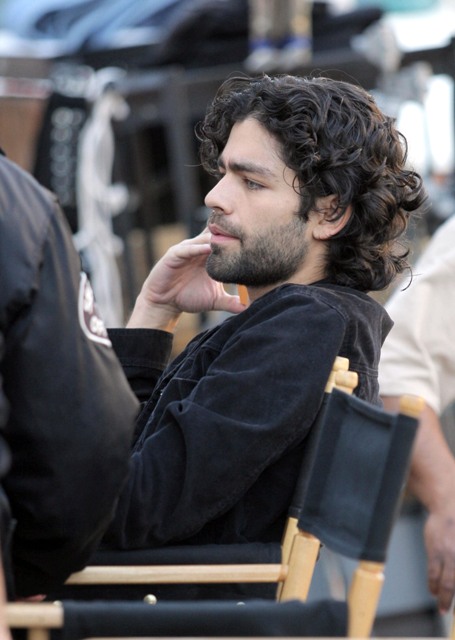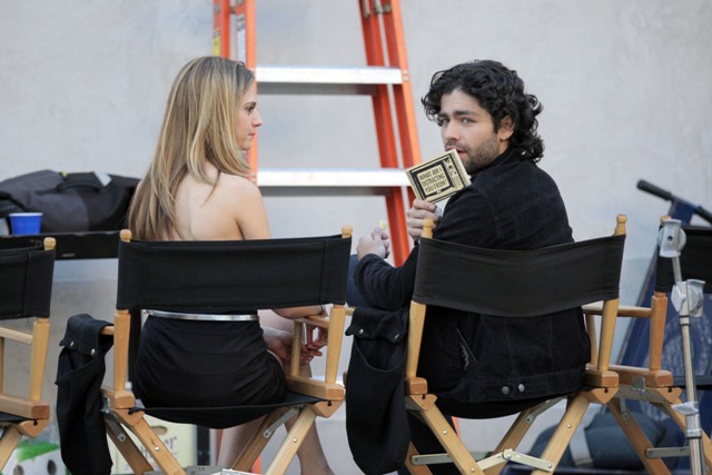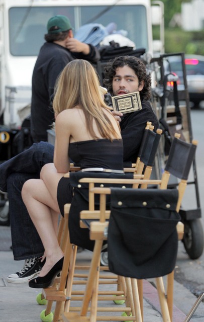 Adrian Grenier yesterday at Villa shooting A COMMERCIAL for American Eagle. Yes. A commercial. With Kim Kardashian for f*ck’s sake. So he’s selling out, which they all do, and pulling a douchebag prank with a postcard – implying that the paparazzi, and by extension the gossip public, should be doing something other than looking at his photos.