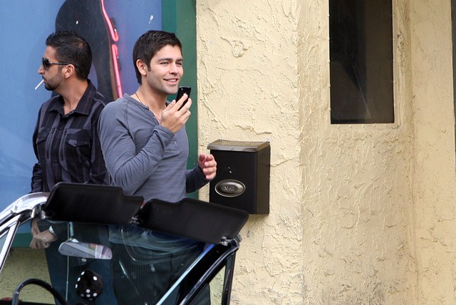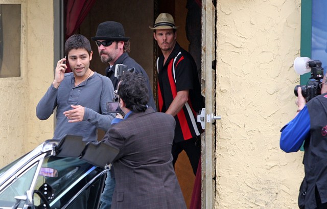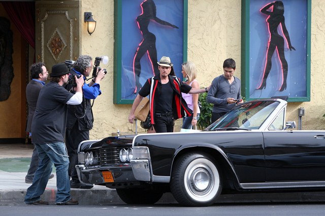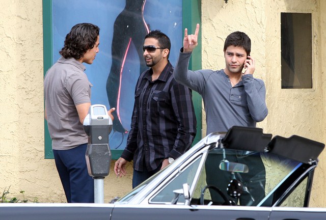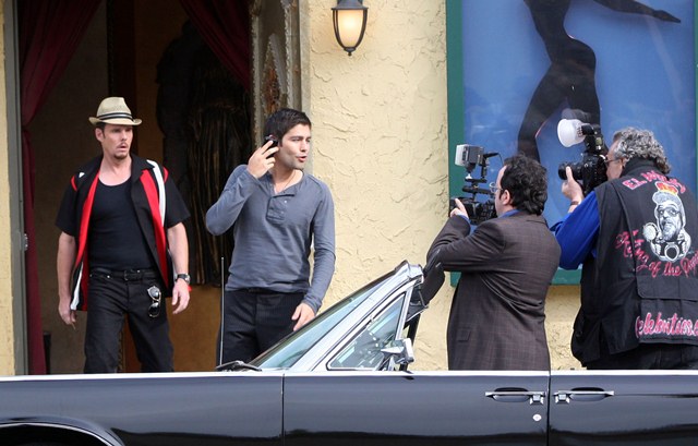Entourage has resumed production. Adrian Grenier and Kevin Dillon were seen on Sunset yesterday shooting outside a peeler bar. So a lot has changed. Actually he looks great with short hair. It’s exactly what he needed. A purge. Detox. Cutting off any remnants of Ebola.