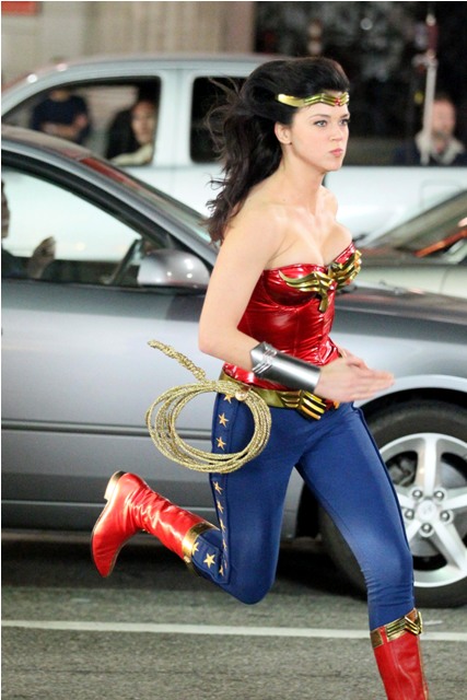 Adrianne Palicki, the new Wonder Woman, was photographed filming in costume in Hollywood yesterday. Most people have noted by now there have been a few tweaks since the first shot of the current iteration was released a couple weeks ago. I’ve attached below for reference.