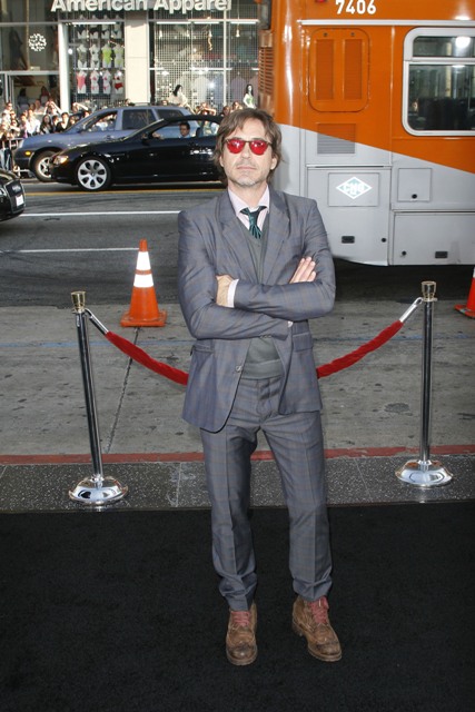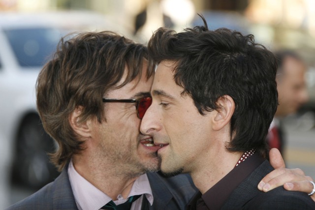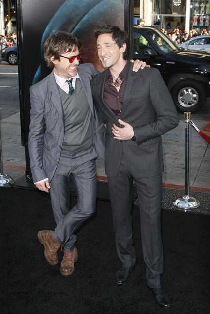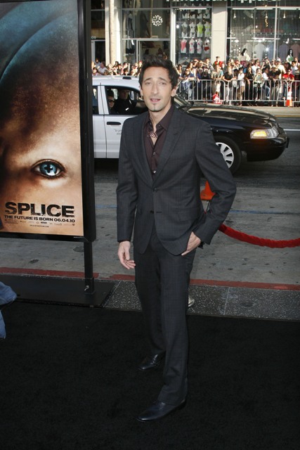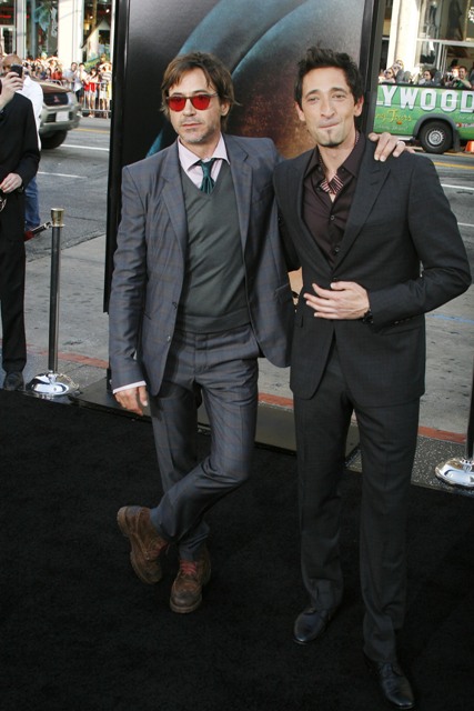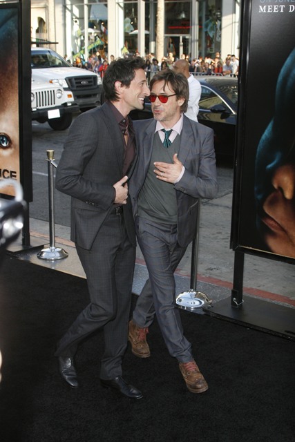 Robert Downey Jr showed up at the premiere of Splice last night in LA and did his movie star friendship duty, posing with Brody on the carpet, working some bromance for the cameras, being charming and irresistible as usual. His appeal however is not contagious. Which is why despite his efforts, he still can’t remove the douche from Adrien Brody’s face. Or his neck. Whatever that is wrapped around his neck. And the smirk. And the posing. And the Ebola.