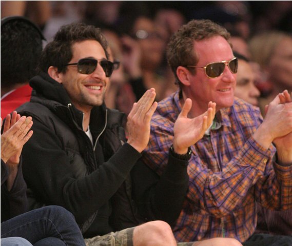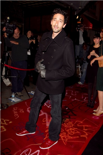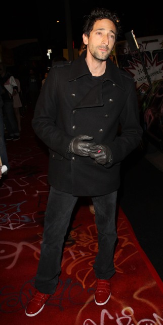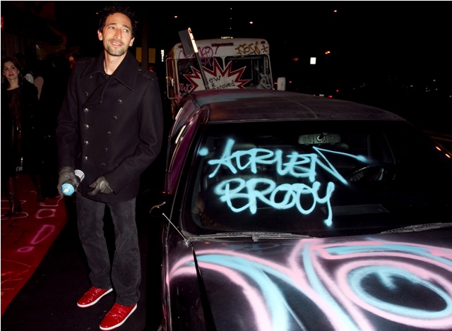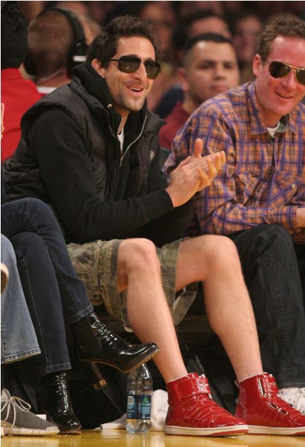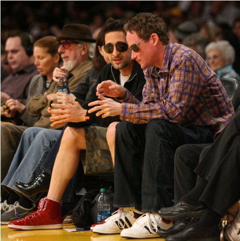 Here he is last night at the Banksy premiere in LA getting all pose-y with the spray cans and his leather gloves. The night before he wore army shorts and red kicks, sat courtside at the Laker game beside a really red-faced friend and kept his shades on during the game.