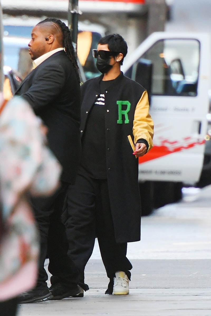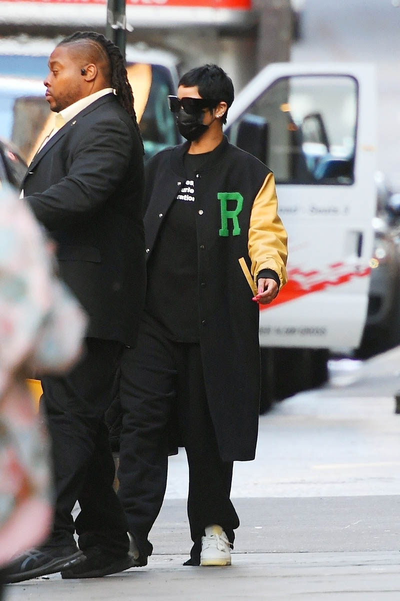 Attached – Rihanna shopping yesterday in NY making me want a varsity jacket with my initial on it. I initial all my sh-t, why don’t I already have one?