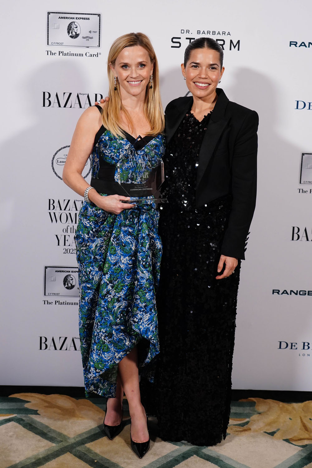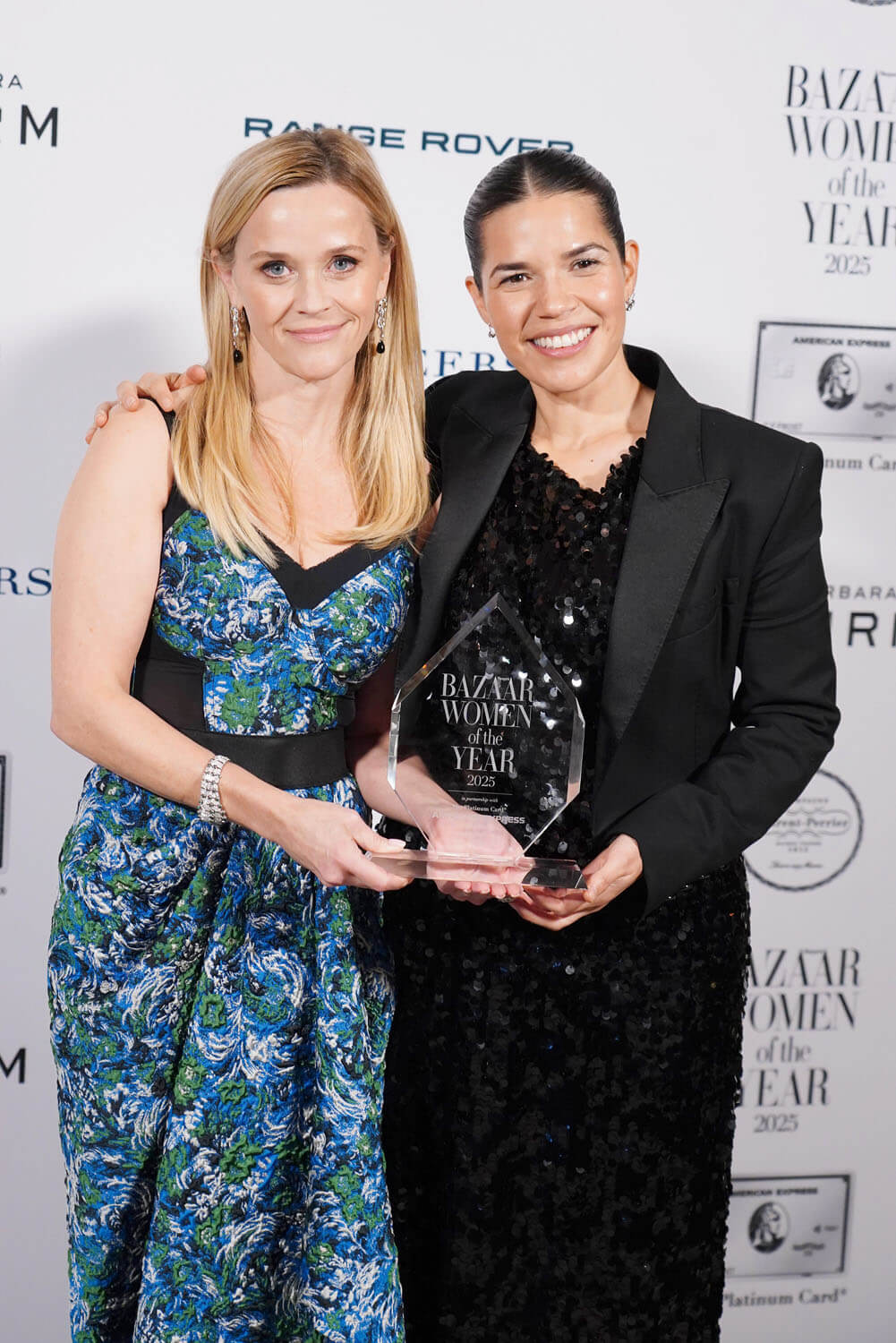 America Ferrara was there with Reese Witherspoon, whose dress looks too much like springtime for November. I generally don’t get bent out of shape about seasonal dressing but the minute I saw this dress I thought “wrong”.