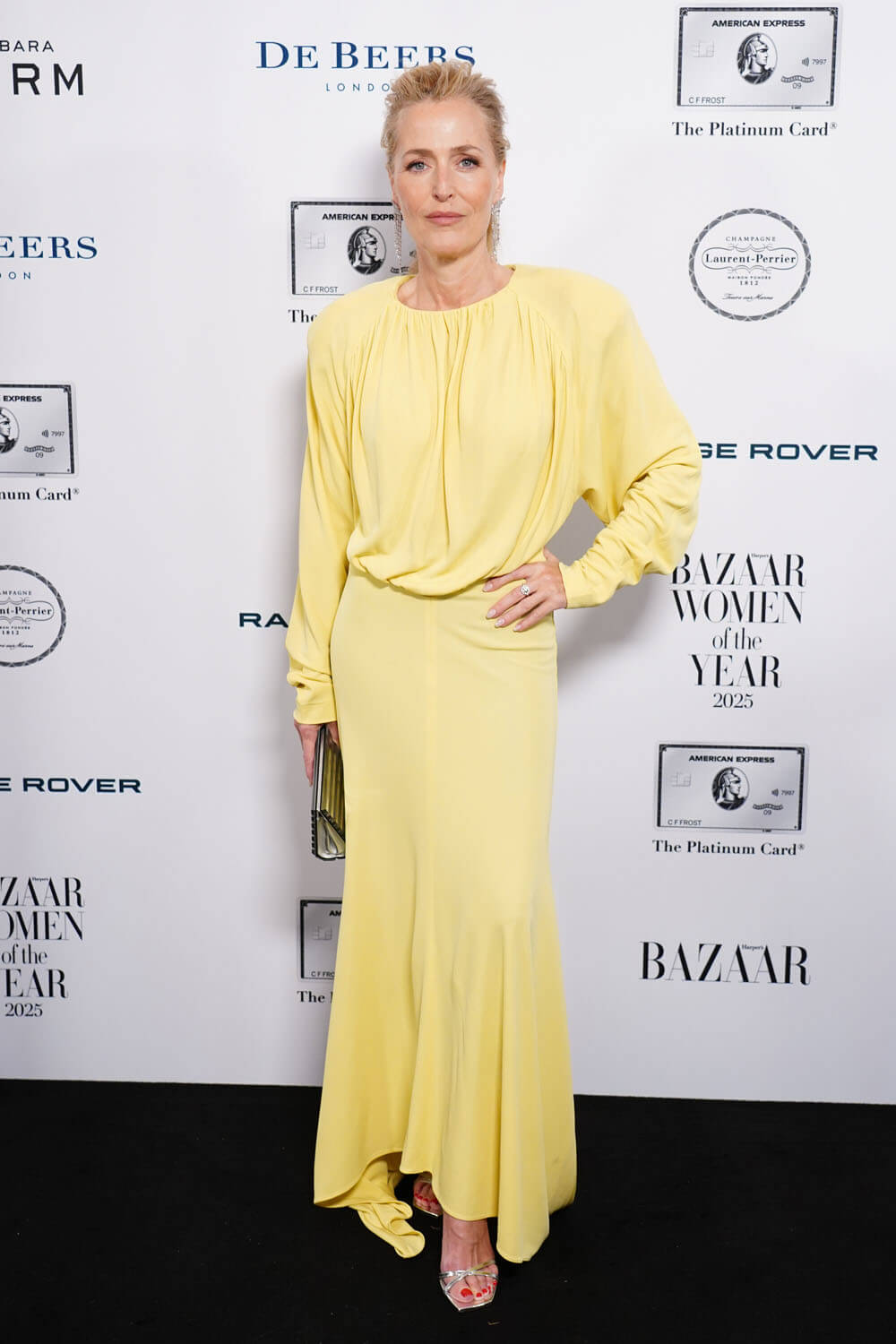 Gillian Anderson also wore yellow, but with power shoulders. She’s the “Entrepreneur of the Year” for her “wellness soda” brand, G Spot. Cute name but the minute you start talking to me about adaptogens, all I hear is bees buzzing.