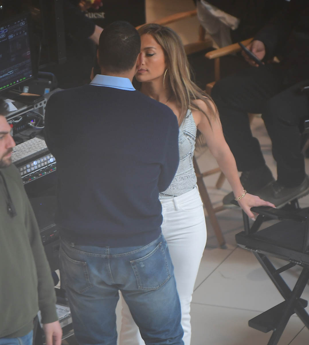 He visited her on the set of Hustlers yesterday. Here she is working on a scene with Constance Wu and ARod is right there behind them at one point. He also brought their kids for a visit. And there was a kiss for the cameras, letting us know that all is right, that they know the sh-t that people are trying to stir and that that’s all it is – it’s sh-t that isn’t going to stop them. That they have confidence in what they have and their presentation of that confidence is supposed to convince us. Are you convinced?