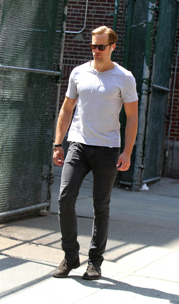 Both Alexa Chung and Alexander Skarsgard were photographed in New York yesterday. She was promoting a clothing line in a cute denim romper with tricked out booties and he was walking around in a white t-shirt, trying to go unnoticed. Alex been on a break for a while, ever since wrapping on Tarzan. I was wondering whether or not there would be a Tarzan panel at Comic-Con. There wasn’t. I don’t remember seeing a trailer for it yet either, have you? I just looked online and, hilariously, found this, obviously not legit but, still, great…in its own way: