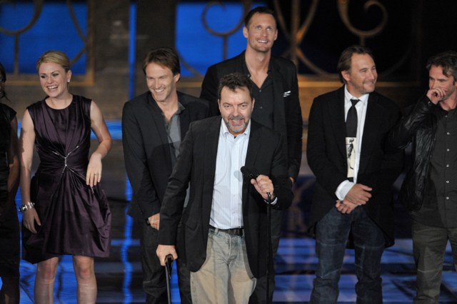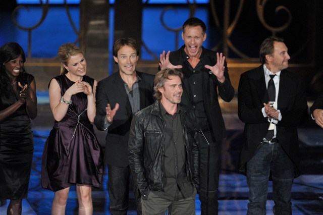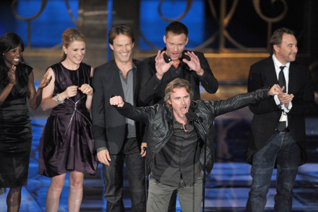 True Blood was honoured Saturday night at the Scream Awards represented by Anna Paquin, Stephen Moyer, Sam Trammell, and the hotness Alexander Skarsgard who also collected the Best Villain Award from costar Kate Bosworth. Alex and Kate have been shooting a film together in Louisiana. Afterwards they were spotted partying with other celebrities who attended the show at the Chateau Marmont. They left at the same time, in the same car, with Kate smugly (and conveniently) captured on camera, unable to conceal her delight.