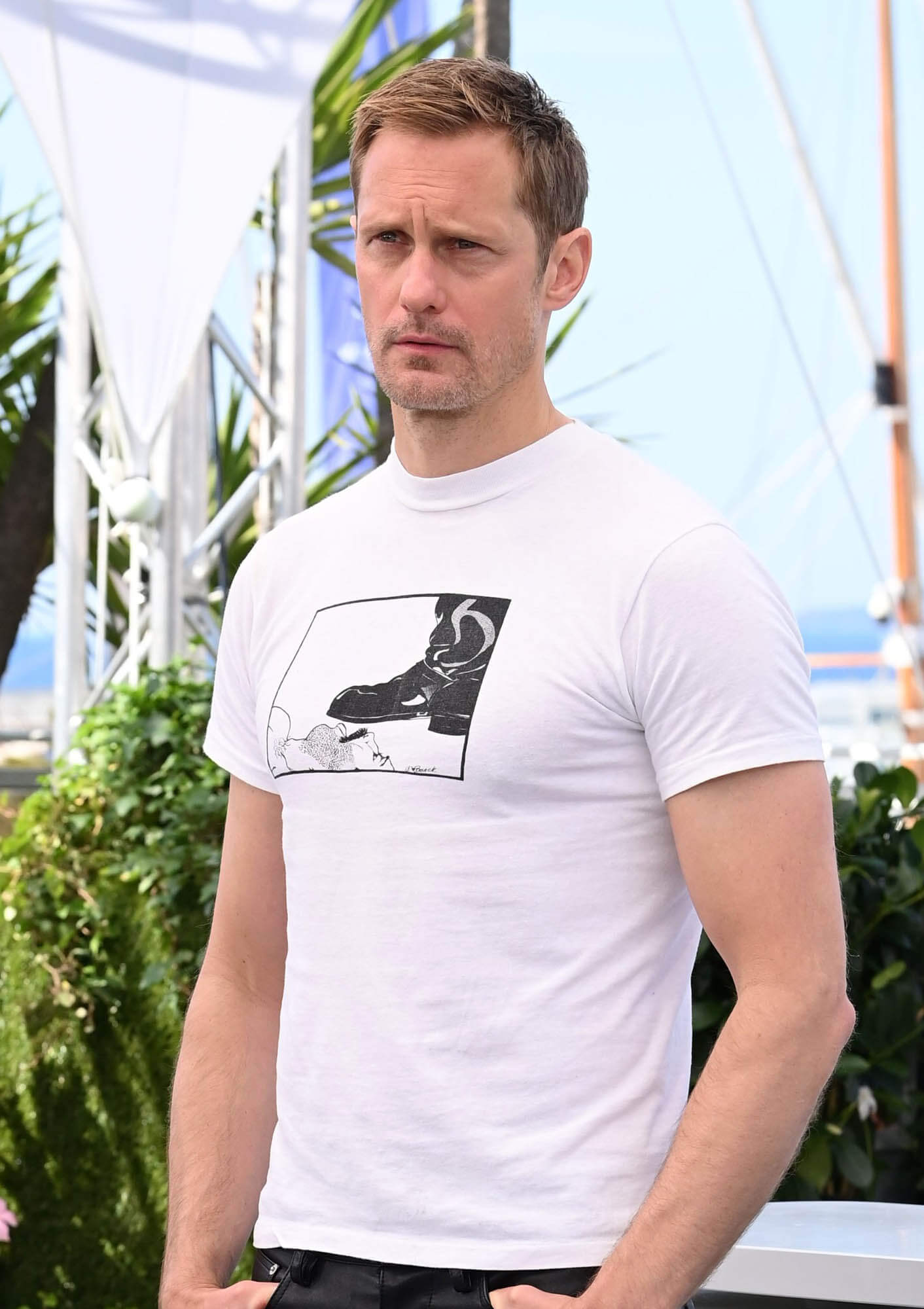 Though the film premiered at Cannes, it didn’t have a gala premiere, which means no black tie, which means Skarsgård showed up in a vintage tee shirt, though one themed for the film—a boot stepping on a man smoking a cigarette.