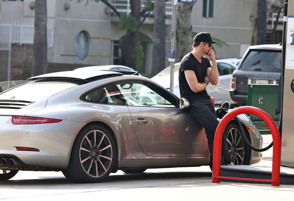 You know the downside to hands-free gas though, if you’re a celebrity? If you go hands-free, you have to pose. Like he’s doing here, leaning on his Porsche, one arm crossing the body and the other hand by his chin, like all fake-pensive. At least when you’re not hands-free, you’re actively doing something, holding onto the nozzle, and if you really want to turn it into a movie moment, you can look up and squint, all busy and important.
