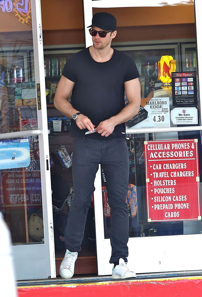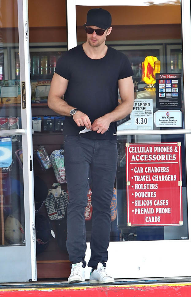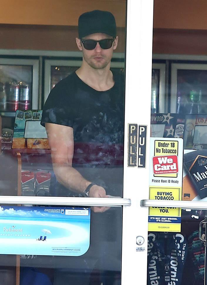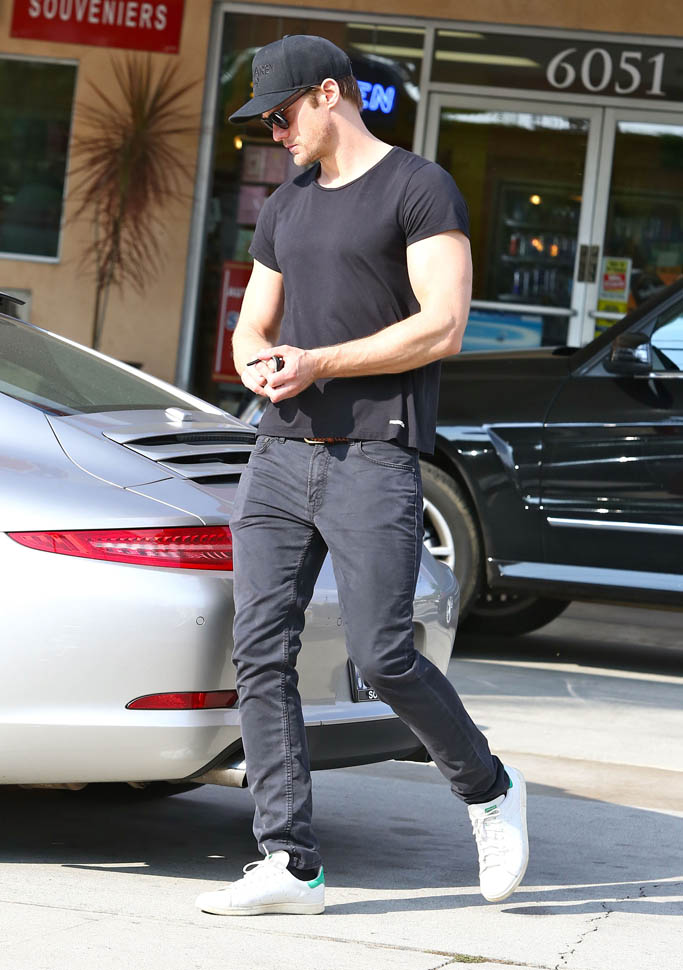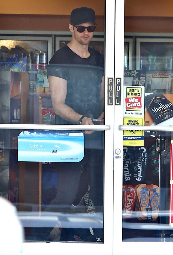Alexander Skarsgard was photographed hands-free on Saturday at a gas station in Hollywood. This hands-free gas pumping thing is like Bigfoot to me. I’ve been driving for 25 years (f-ck me, I’m old) and I’ve never, ever, ever found a hands-free pump. Is it an American thing? Jacek and I talked about it this morning when he was driving me to work. He’s only ever pumped hands-free in the US. It’s like having internet on an airplane, available for probably a decade – or more – now on US flights but still not a standard service in Canada, what the F-CK is taking so long?