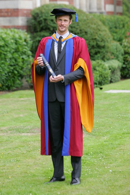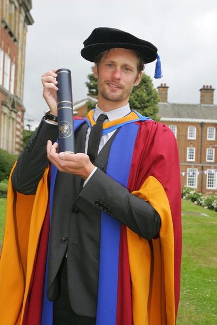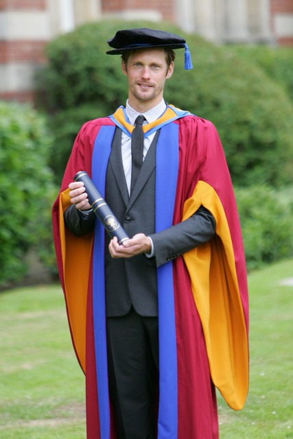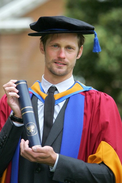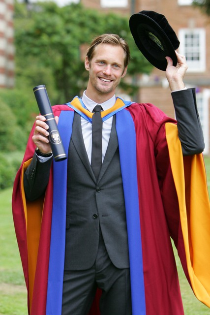 Check out Alex Skarsgard in official doctorate attire at Leeds University today in England receiving an honourary degree. Now Colin Firth miiiiiiiight be able to make this work. The Princes Will and Harry maaaaaaybe too. Even Brad Pitt is a stretch though. And George Clooney? Forget about it. So Alex Skarsgard? Not even close. And this, this is how I see him now on True Blood without Eric's memory. Even with his shirt off he may as well be wearing this and a dorky expression.