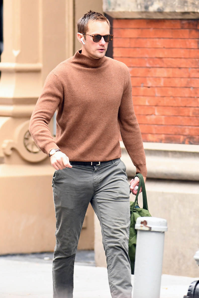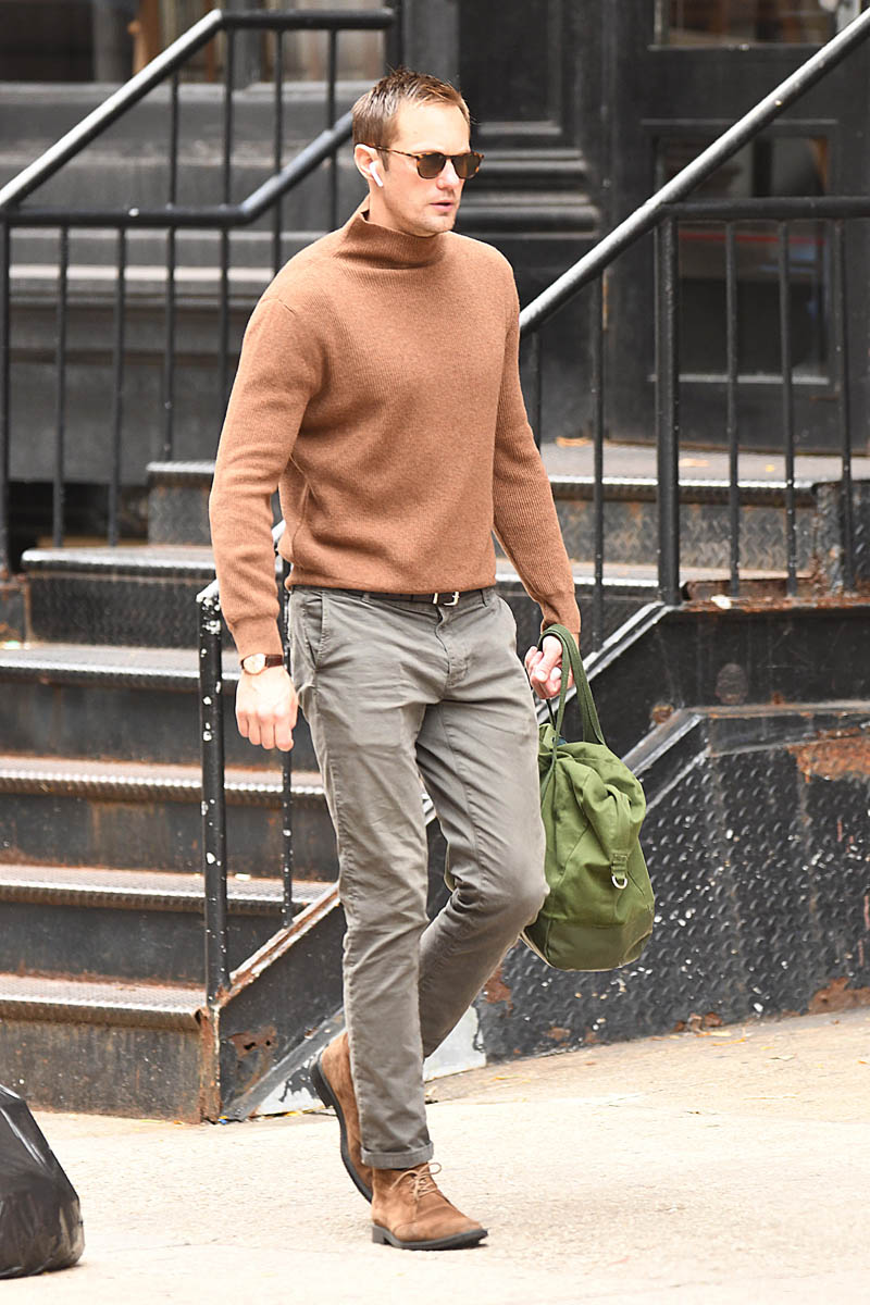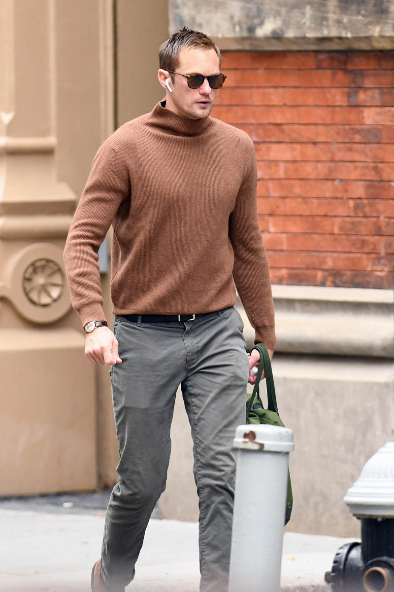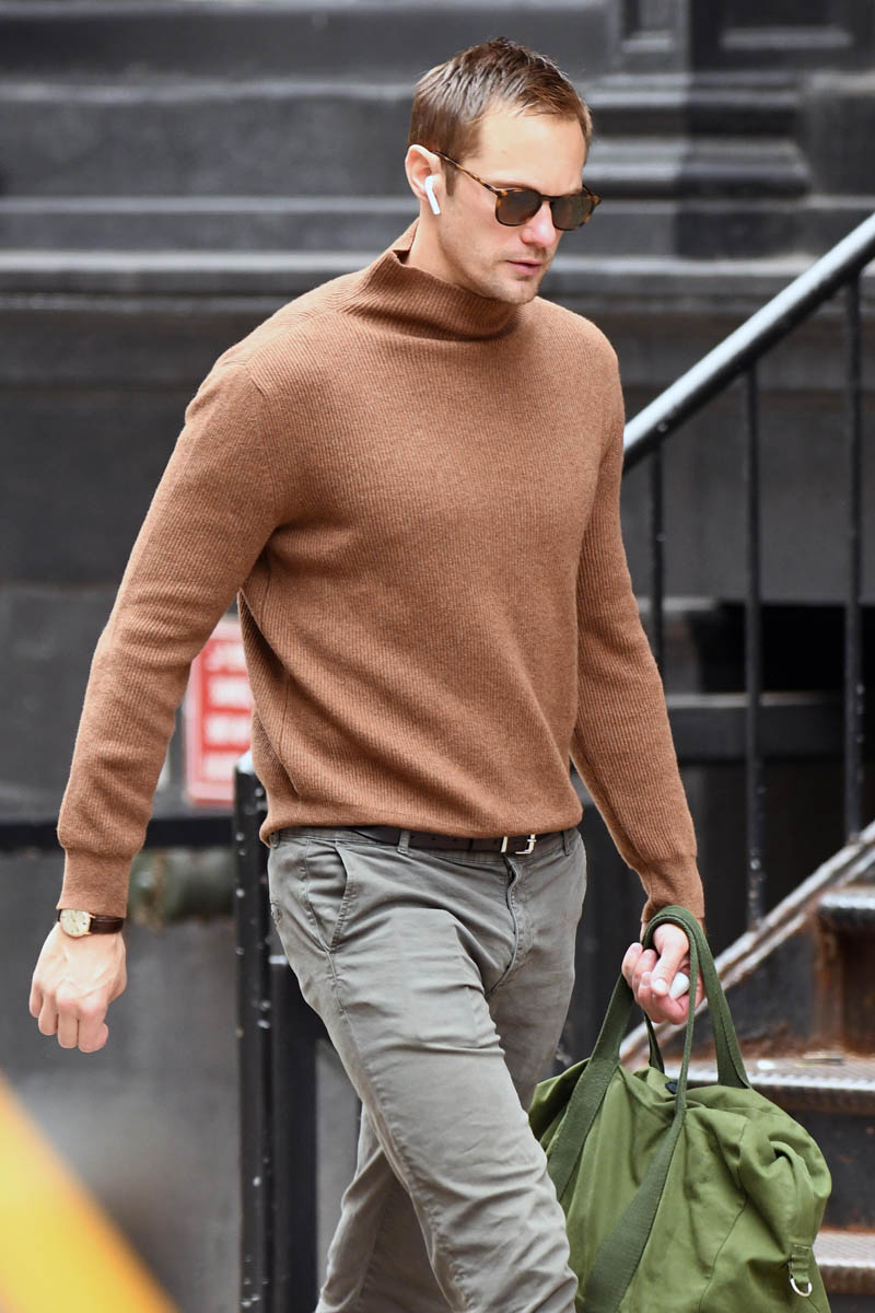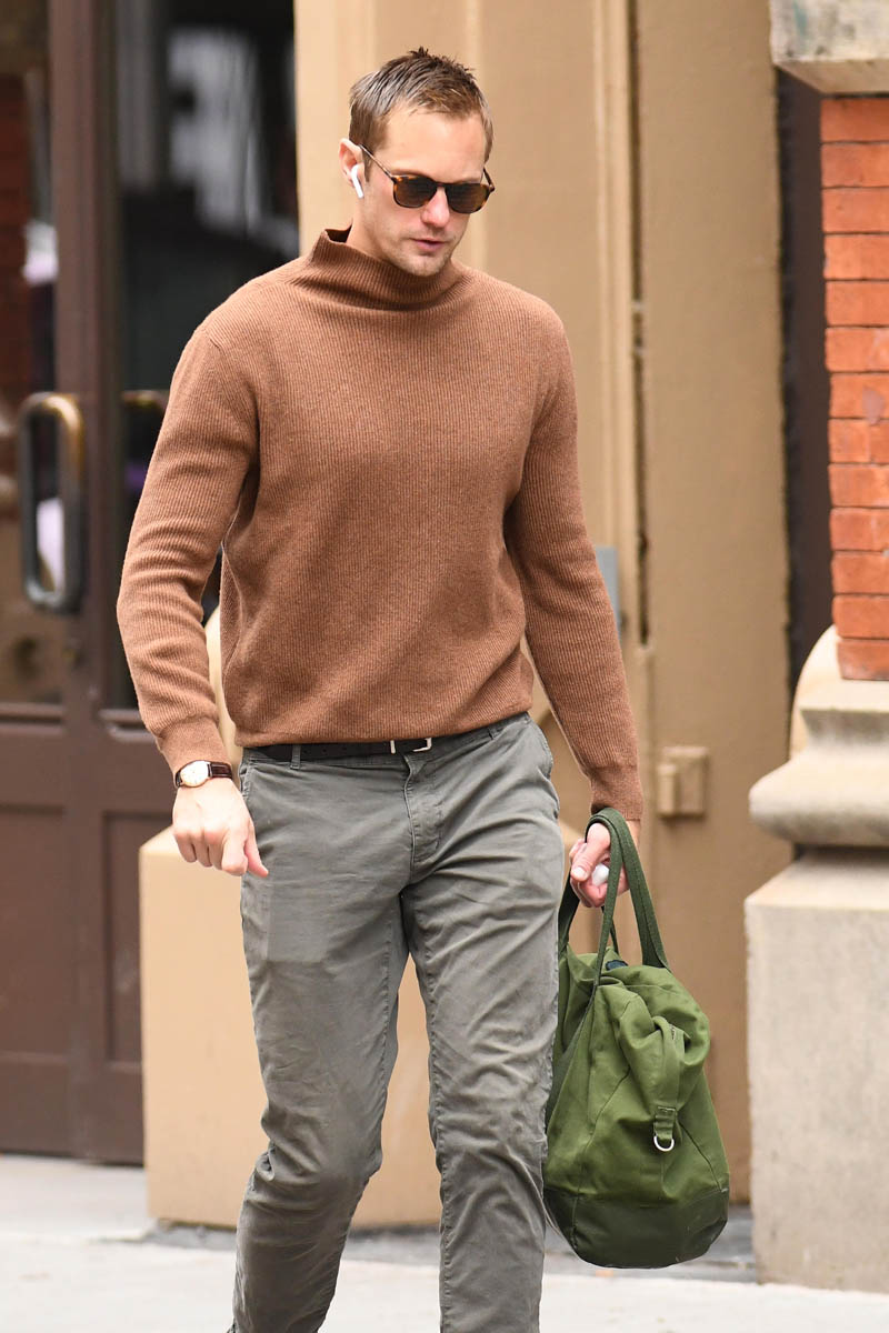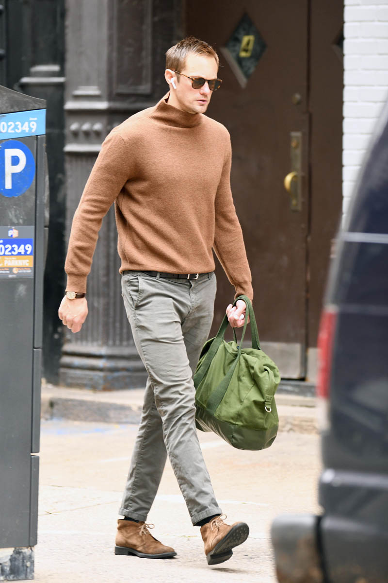 Can we talk about his outfit now? I like it. He looks good in a turtleneck. He looks good in these pants. And he’s all matchy matchy with the sweater and the shoes so I wonder if that green bag is deliberate, so as not to look too matchy matchy. Why have we never considered Gossip Genie-ing Alexander Skarsgard with Jennifer Aniston? He knows Reese Witherspoon from Big Little Lies. Reese knows Jen from years and years and Friends. Reese could and would TOTALLY set that up, non?