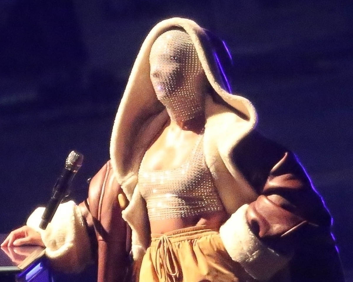 First of all, her face, her skin, so pretty with the pale pink lips and not much fuss on the eyes. And I love the long braid with the big hoops. You’ll see that the sparkly tank top has a matching mask. This is a fashion mask. She’s not wearing it to greet people, we don’t have to get mad about her compromising health and safety – it’s a purely aesthetic decision; she’s filming, there’s no Lana Del Rey going on here. But also, Alicia’s mask doesn’t look like mesh to me. There are no holes. It’s a solid piece of fabric tricked out with embellishment so I feel like it functions in much the same way as the cloth masks so many of us are wearing these days. Am I wrong? Have a closer look and let me know.