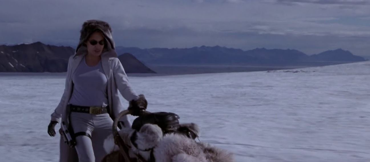 Angelina Jolie as Lara Croft rides on a sled and it was a badass scene then and I still love it now. That coat made it.