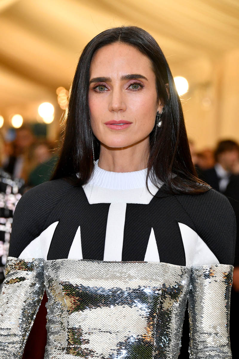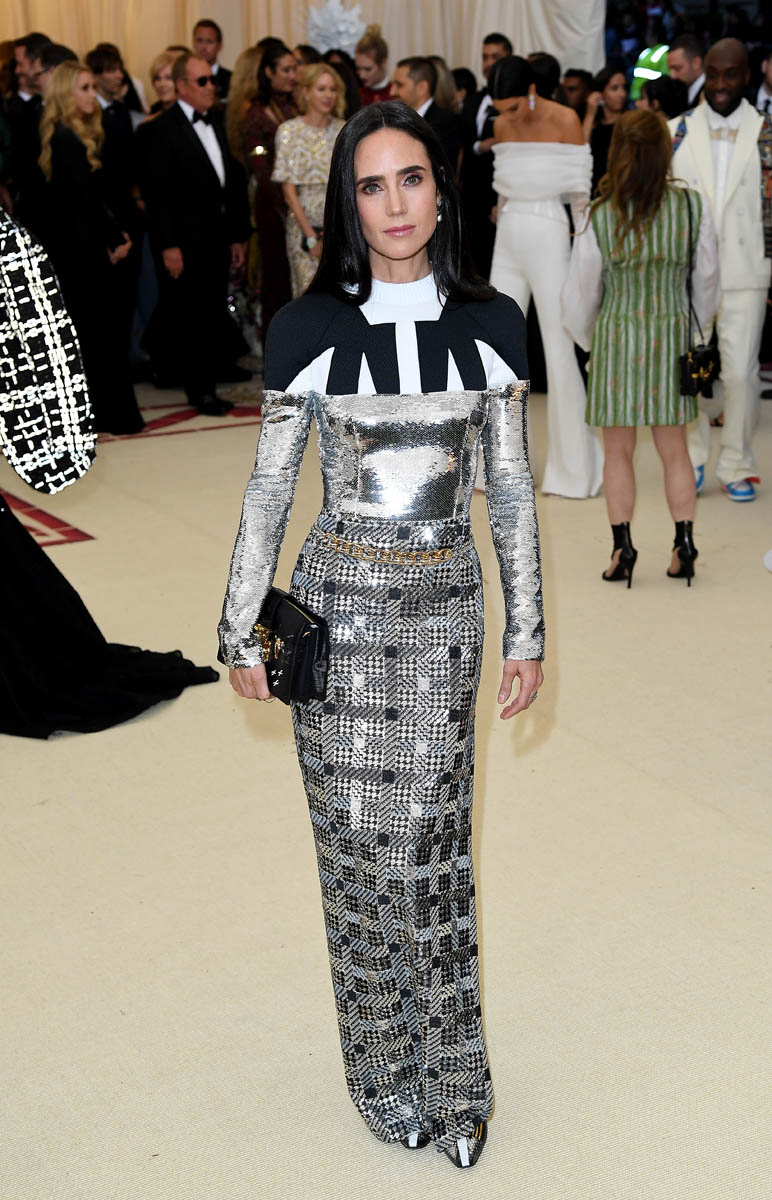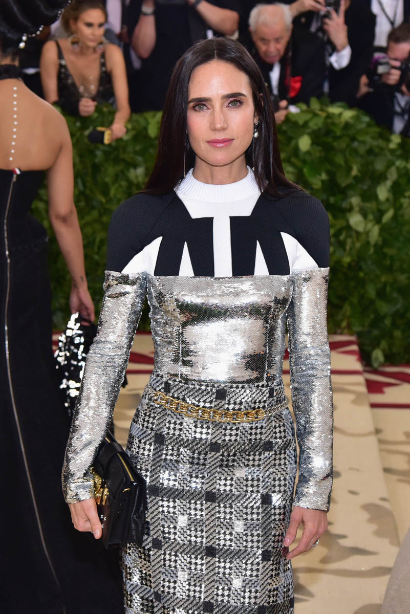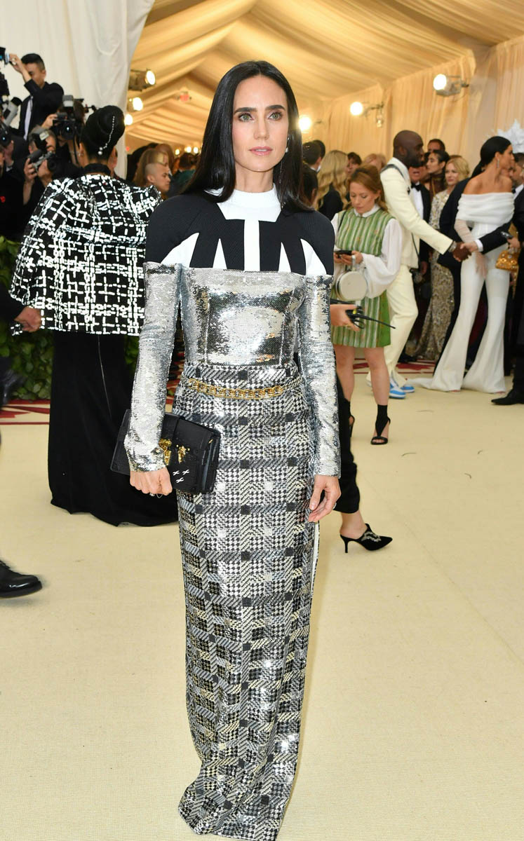 Jennifer Connelly’s also incorporates the guimpe, but the black and white doesn’t completely work with the silver (there’s a lot of pairing of those three colours tonight). It’s almost pattern-blocked, but not quite. Instead, the two elements up top (the black and white shoulders in a ribbed fabric and the silver torso) and the patterned skirt look like two dresses that were sewn together at the last minute (or maybe it’s actually a two piece, I can’t quite tell?). It would have been a much cooler and more interesting look if they stuck with the geometric pattern through the torso, and nixed silver above the waist. I think the silver part of the top was supposed to draw the two halves together in an attempt to avoid a pattern clash. They should have embraced it. What absolutely needs to go is the chain belt – it’s so unnecessary.