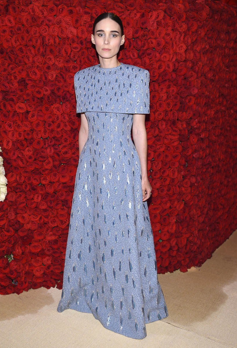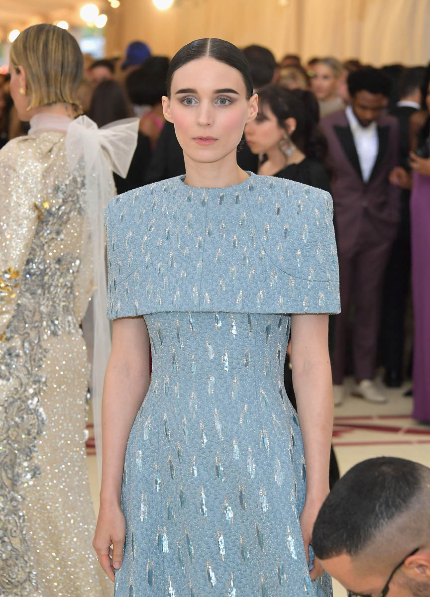 Was the blue gown chosen to evoke the Virgin Mary, who is often depicted surrounded by a halo of light and dressed in blue? Did she sense that the carpet would be awash in black and white and want to stand out, without dressing in a costume? Her hair and makeup choices work very well with the overall theme, too – the severe part in her hair and minimalist makeup, combined with the modesty of the gown, feel austere to the edge of repression, very Catholic. Part of what makes me eye-roll Rooney as a celebrity is her aloofness and detachment, even while at an event packed with her peers; that’s also what makes the whole look greater than the sum of its parts.