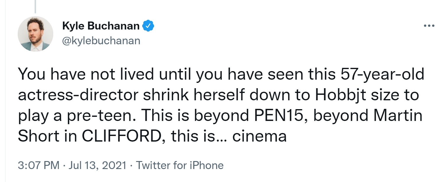 Aline, an official selection of the Cannes Film Festival, is written by, directed, and starring French actor/singer/comedian Valerie Lemercier. She is 57 years old, and she plays “Aline”, a character “freely inspired” by Celine Dion, from ages FIVE to 50. Lemercier is not only de-aged in the film, but SHRUNK DOWN to play a child in a movie she wrote and directed for herself based on the life of Celine Dion. Even Martin Short didn’t go to those lengths when playing a deranged ten-year-old in Clifford; he just stood on his knees and made no other attempt to be a “convincing” child, because there is no way to make a middle-aged adult into a convincing child.