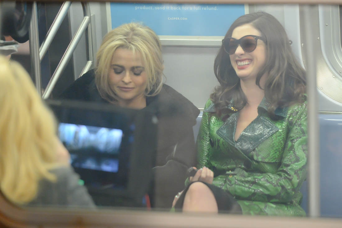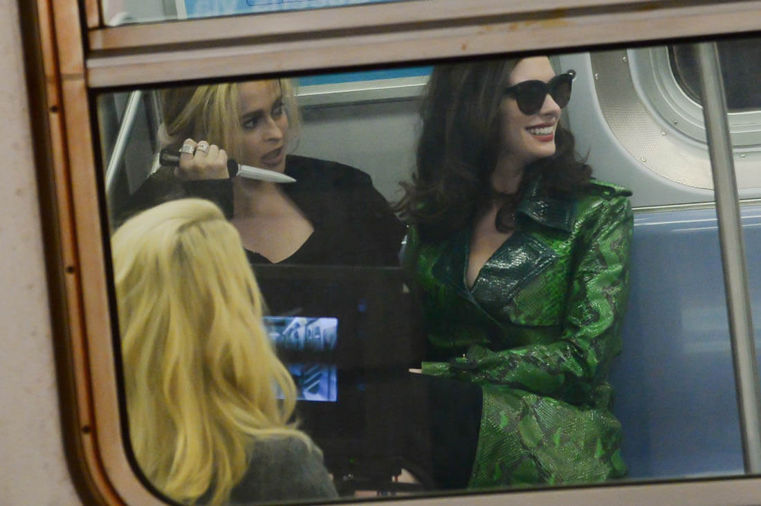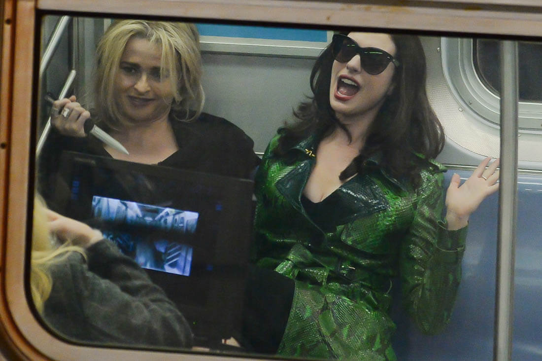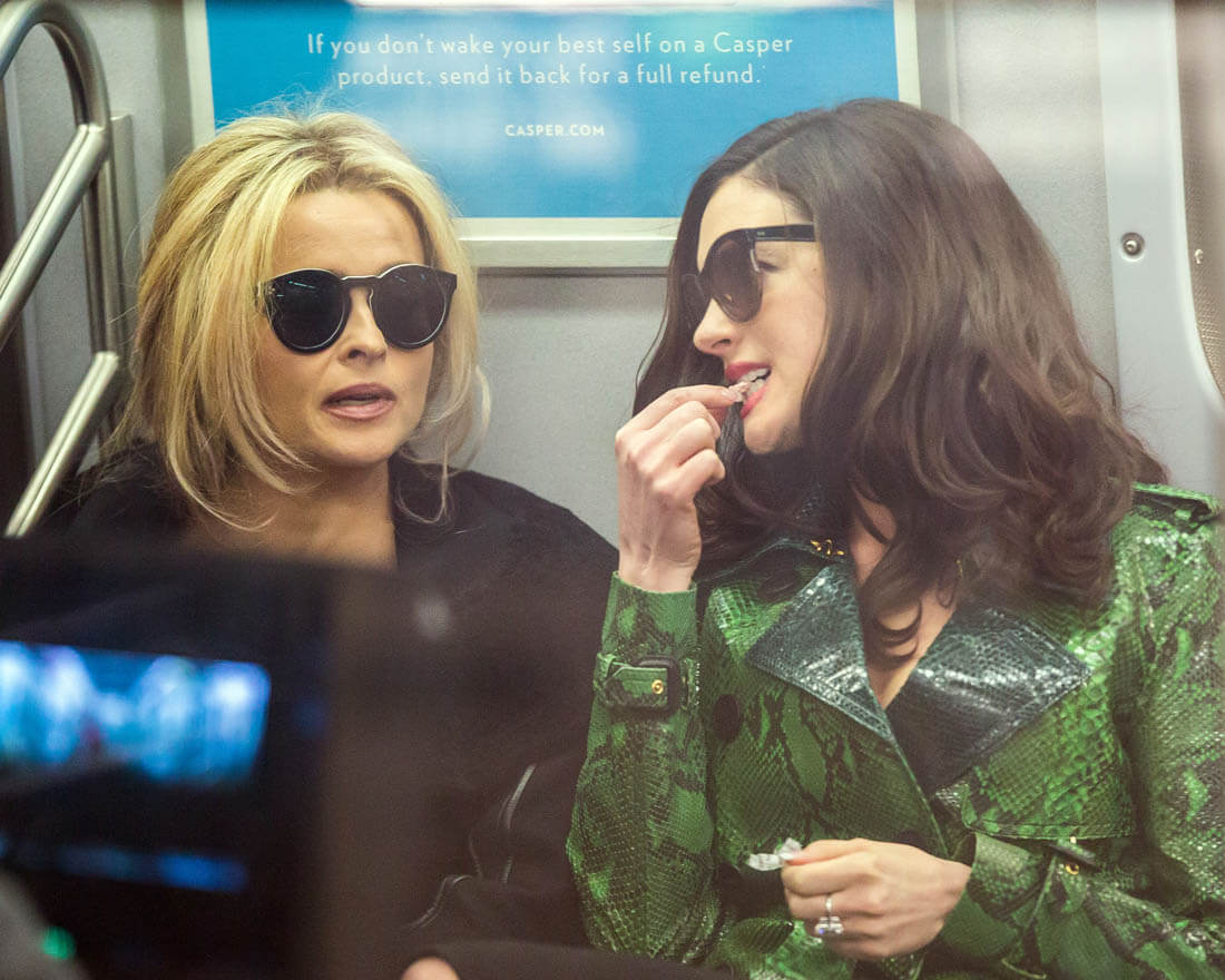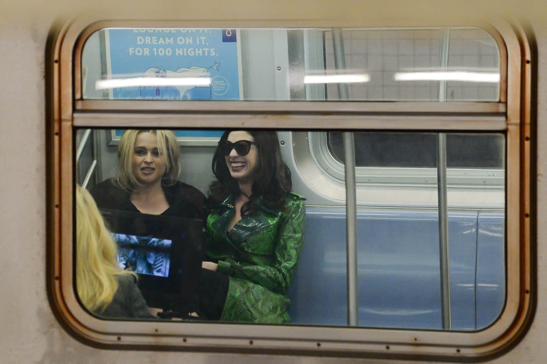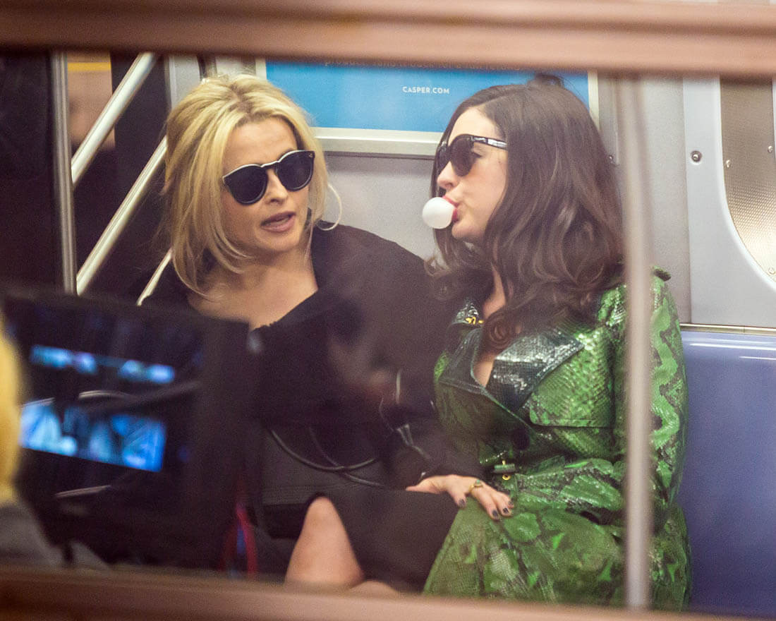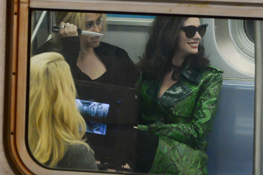 Ocean's Eight continued filming in New York this weekend and all eight women were on set for a scene on the subway: Sandra Bullock, Cate Blanchett, Rihanna, Anne Hathaway, Sarah Paulson, Mindy Kaling, Awkwafina, and Helena Bonham Carter. I can’t wait to see this movie. I can’t stand that we still have to wait almost another year for it. I want to see how these characters are represented. I want to see these women bring those representations – presumably, considering the diversity of the cast – a wide variety of representations, to life. Right now, based only on costumes, I have some ideas. Kathleen wrote about Rihanna’s hacker girl a couple of weeks ago. As for Anne Hathaway…