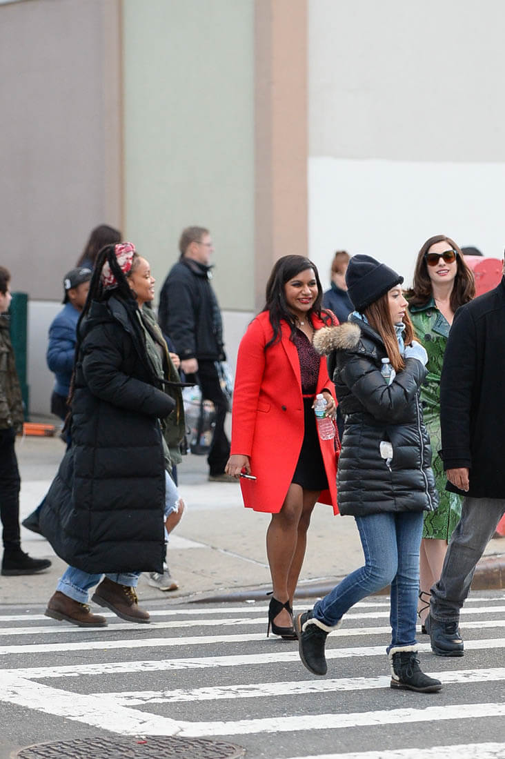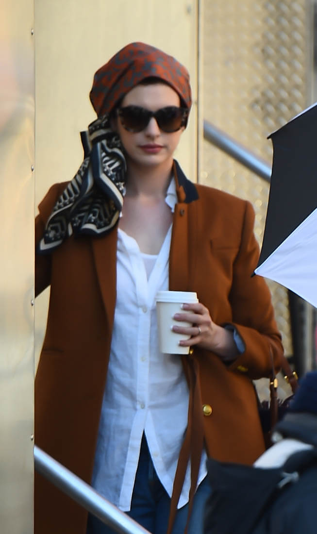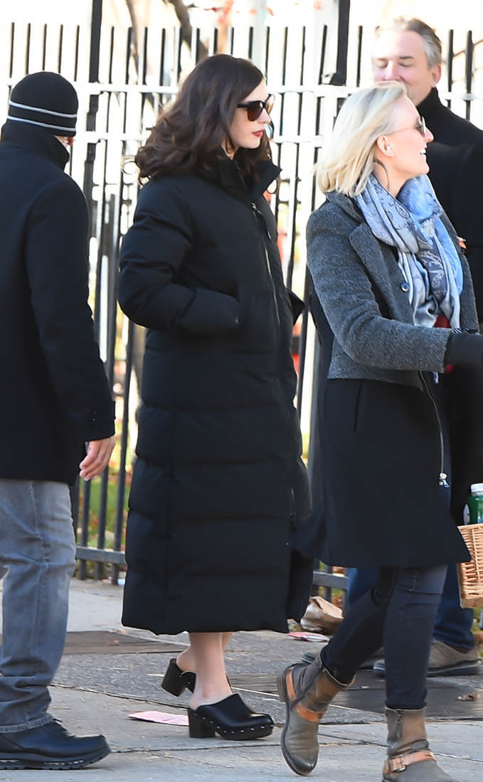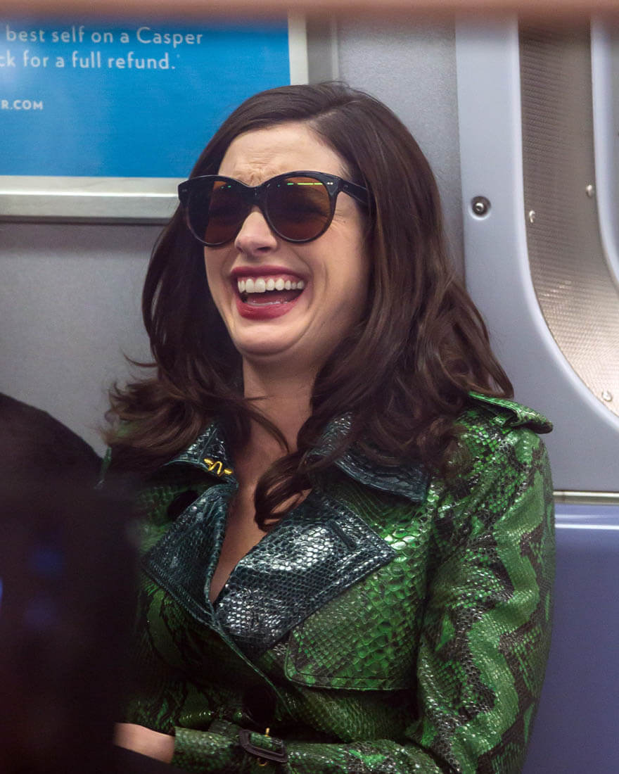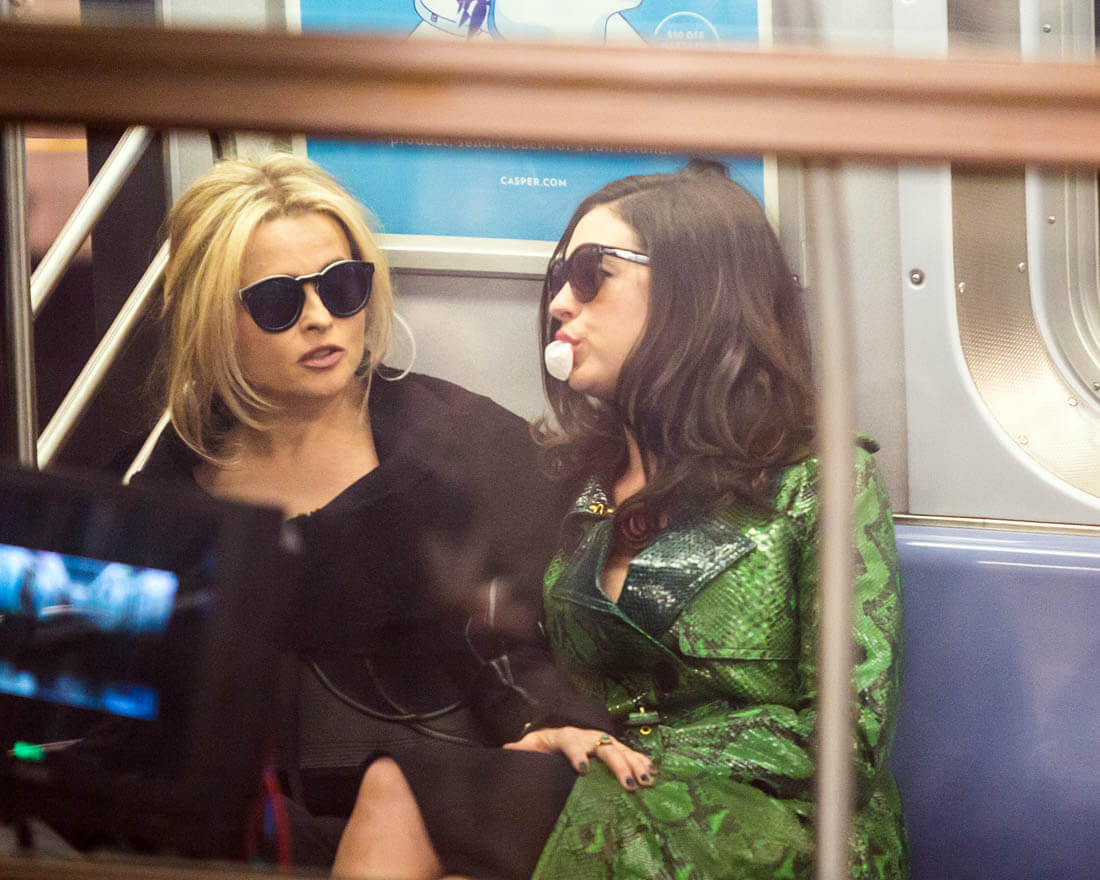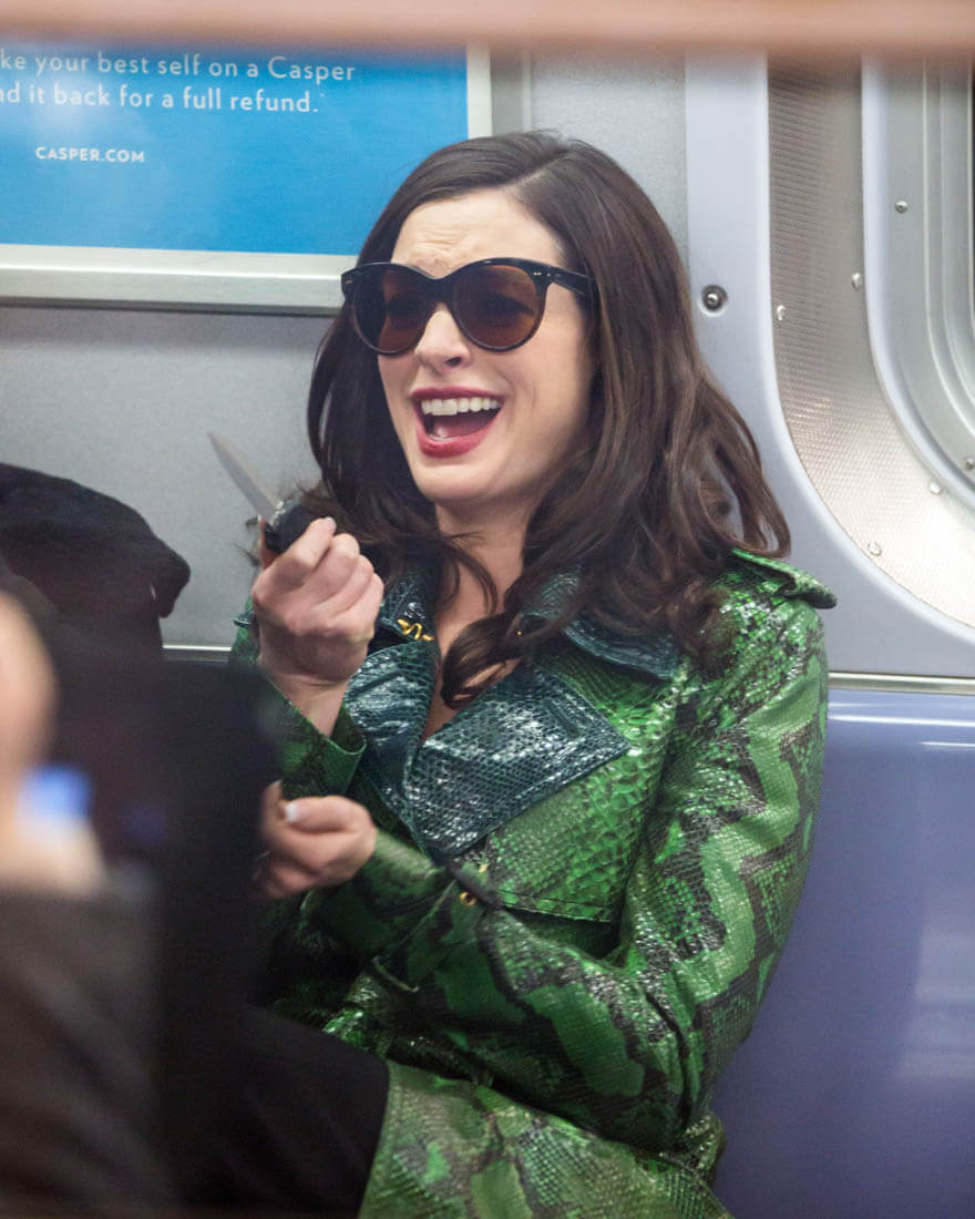 Ocean's Eight continued filming in New York this weekend and all eight women were on set for a scene on the subway: Sandra Bullock, Cate Blanchett, Rihanna, Anne Hathaway, Sarah Paulson, Mindy Kaling, Awkwafina, and Helena Bonham Carter. I can’t wait to see this movie. I can’t stand that we still have to wait almost another year for it. I want to see how these characters are represented. I want to see these women bring those representations – presumably, considering the diversity of the cast – a wide variety of representations, to life. Right now, based only on costumes, I have some ideas. Kathleen wrote about Rihanna’s hacker girl a couple of weeks ago. As for Anne Hathaway…