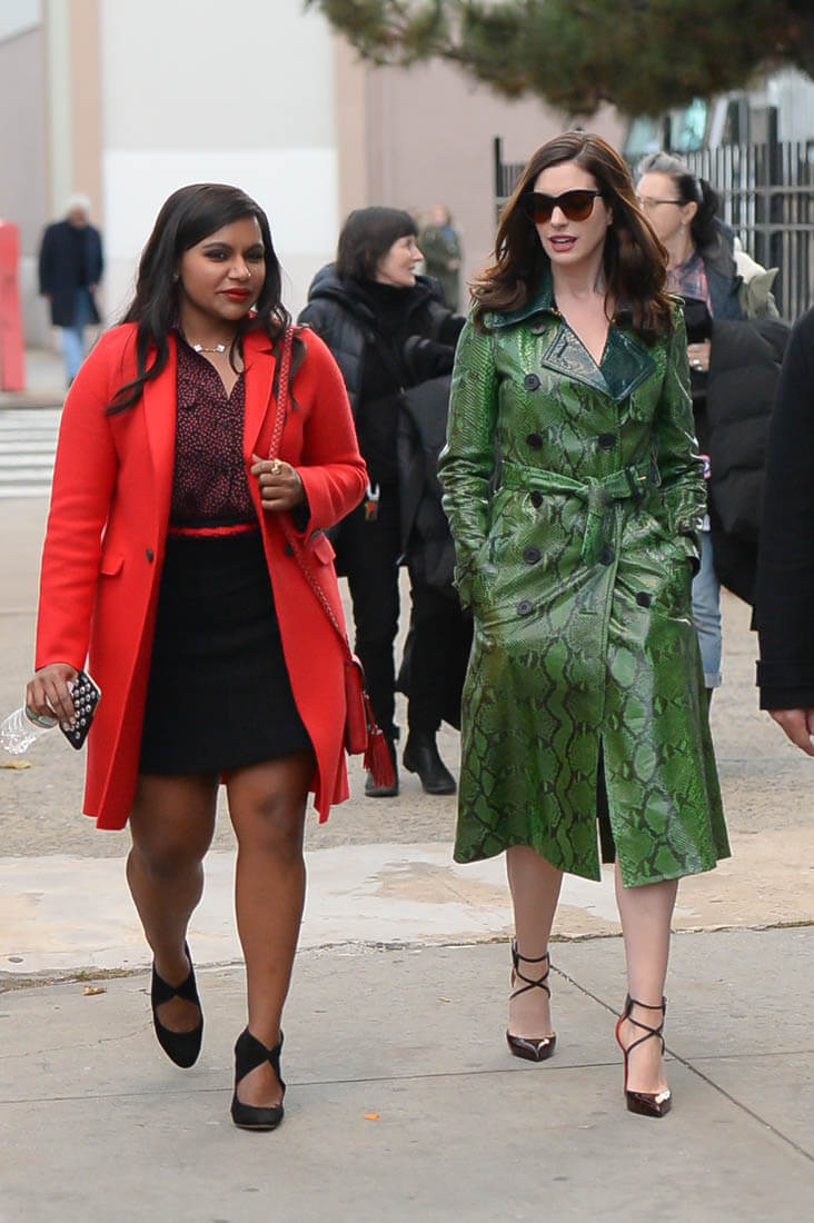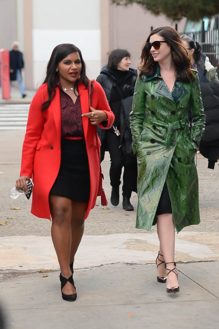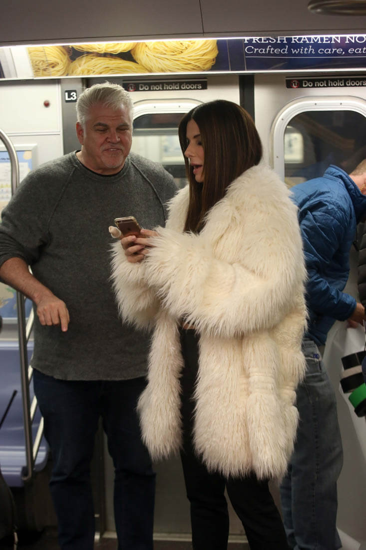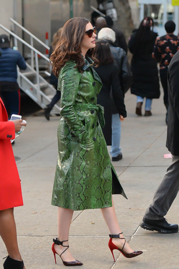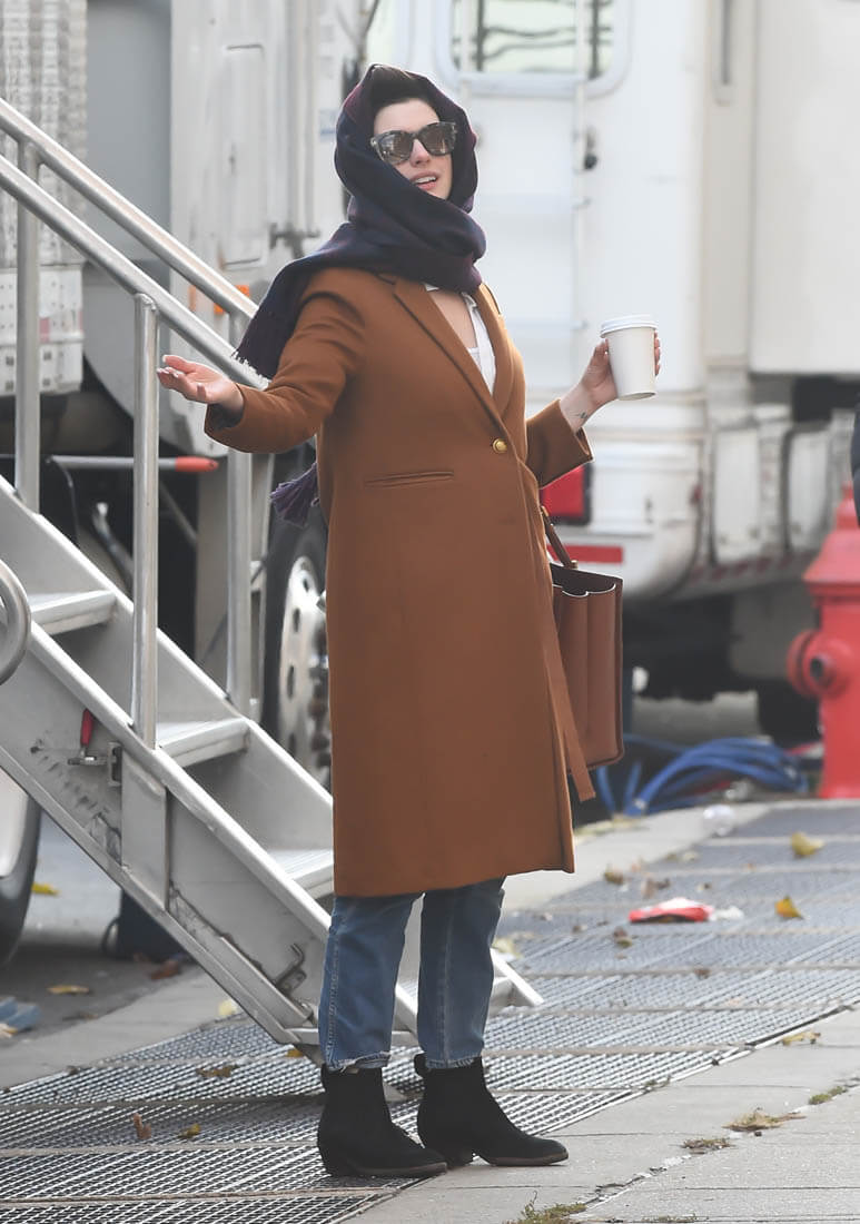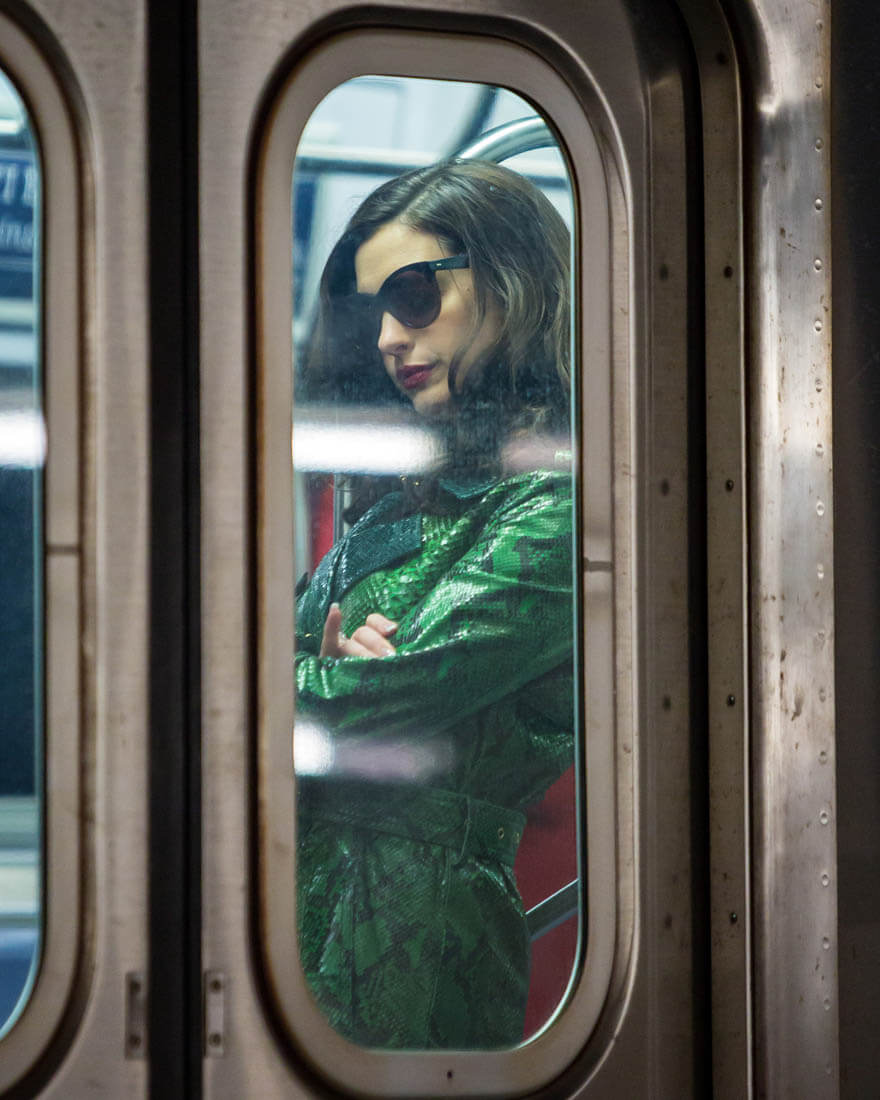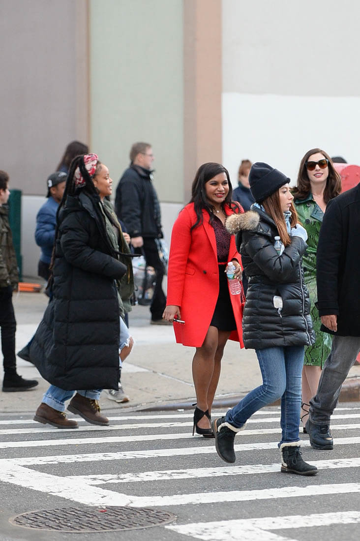 Ocean's Eight continued filming in New York this weekend and all eight women were on set for a scene on the subway: Sandra Bullock, Cate Blanchett, Rihanna, Anne Hathaway, Sarah Paulson, Mindy Kaling, Awkwafina, and Helena Bonham Carter. I can’t wait to see this movie. I can’t stand that we still have to wait almost another year for it. I want to see how these characters are represented. I want to see these women bring those representations – presumably, considering the diversity of the cast – a wide variety of representations, to life. Right now, based only on costumes, I have some ideas. Kathleen wrote about Rihanna’s hacker girl a couple of weeks ago. As for Anne Hathaway…