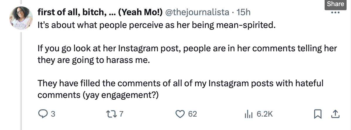 I think this is the problem people encounter when trying to decide how they feel about Amanda. It can be difficult to vouch for someone who is often guilty of what she accuses others of. In this case, she’s claiming that she’s under attack, meanwhile she’s using her considerable platform to slam a writer, a Black woman at that, who wrote an opinion piece about very loud and public claims Amanda made in the first place, and has repeatedly doubled down on since making. Is she not expecting this to be a topic of conversation? Is she truly expecting that every single person who heard her claims would just…agree?
