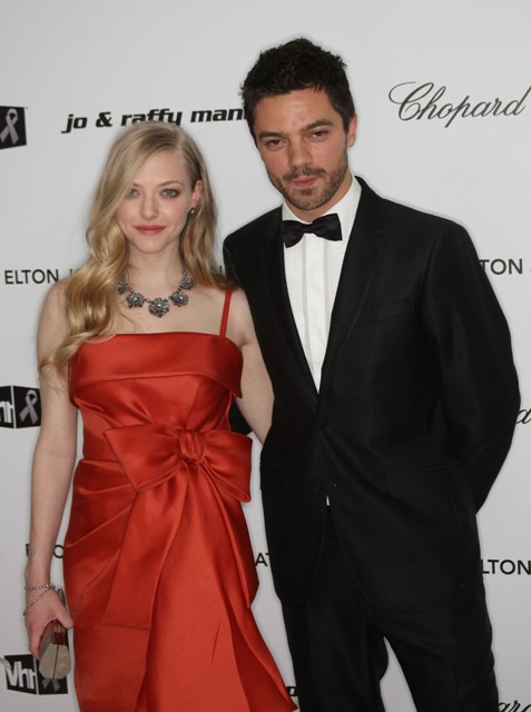 This is Amanda with Dominic Cooper at Elton John’s party after the Governor’s Ball. Am told they totally loved it up on the carpet but declined interviews together because she was tired. I’d be exhausted too. She flew in from Toronto where she’s shooting a movie and she’s flying right back out this morning. But it’s important to work hard when you’re hot.