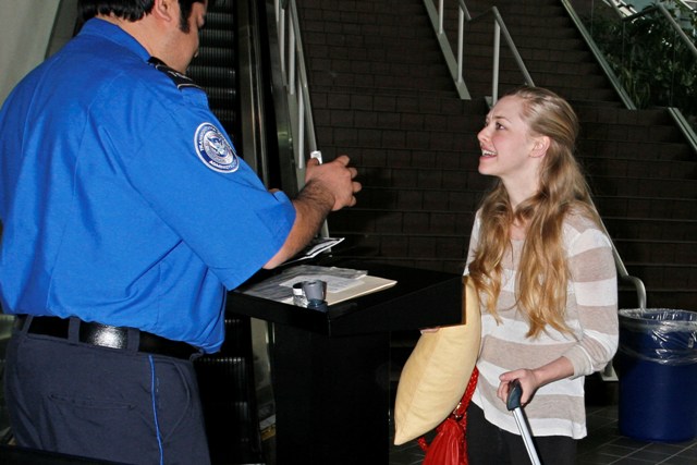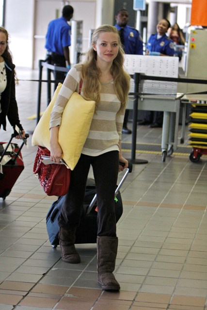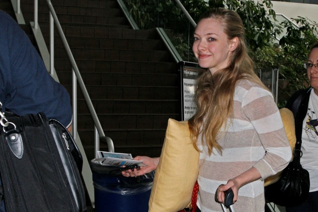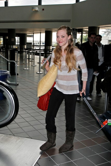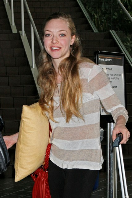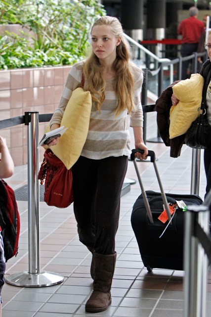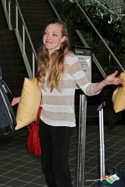 Amanda Seyfried has been shooting a new movie in Toronto. She was in LA for the weekend for the Oscars, then had to return immediately Monday back to work. Dominic Cooper went with her. This is Amanda arriving at LAX yesterday. Dominic met her later.
