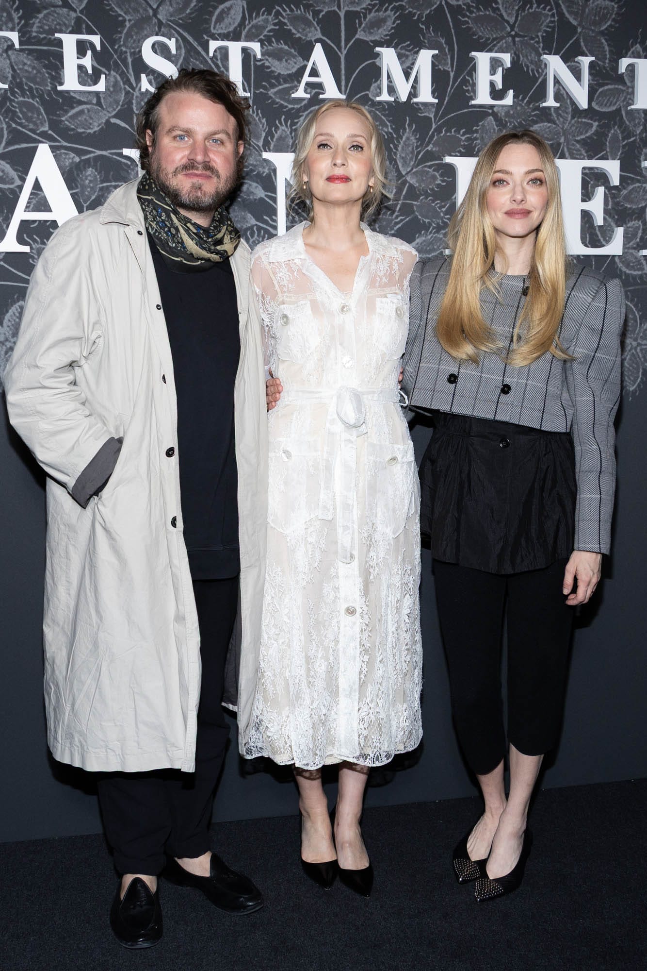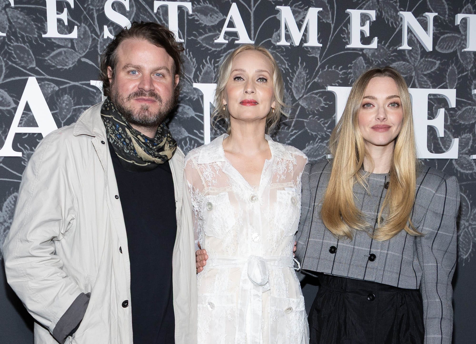 Brady Corbet, Mona Fastvold and Amanda Seyfried attend the Special screening of Searchlight Pictures "The Testament of Ann Lee" at Cinema Max Linder on February 17, 2026 in Paris, France