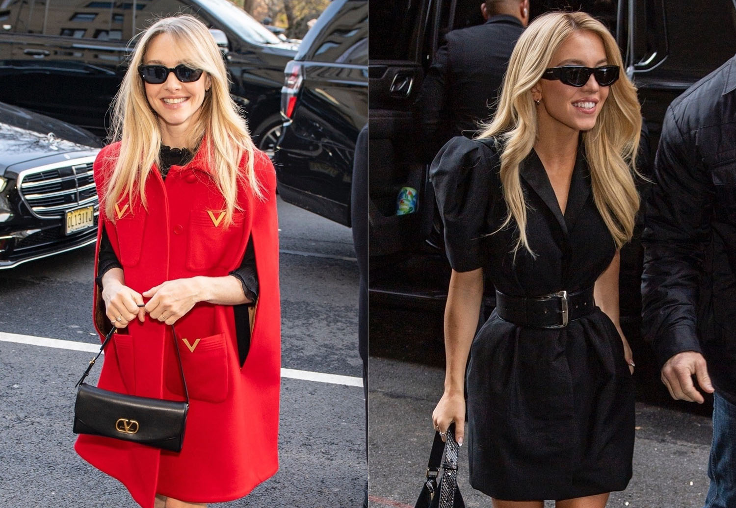 Once again, I do not hate Sydney’s outfit, a belted black dress, though I assume she’s cold. I think being actor is 90% pretending you’re not cold.