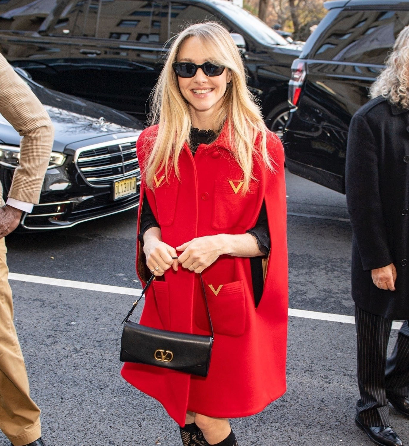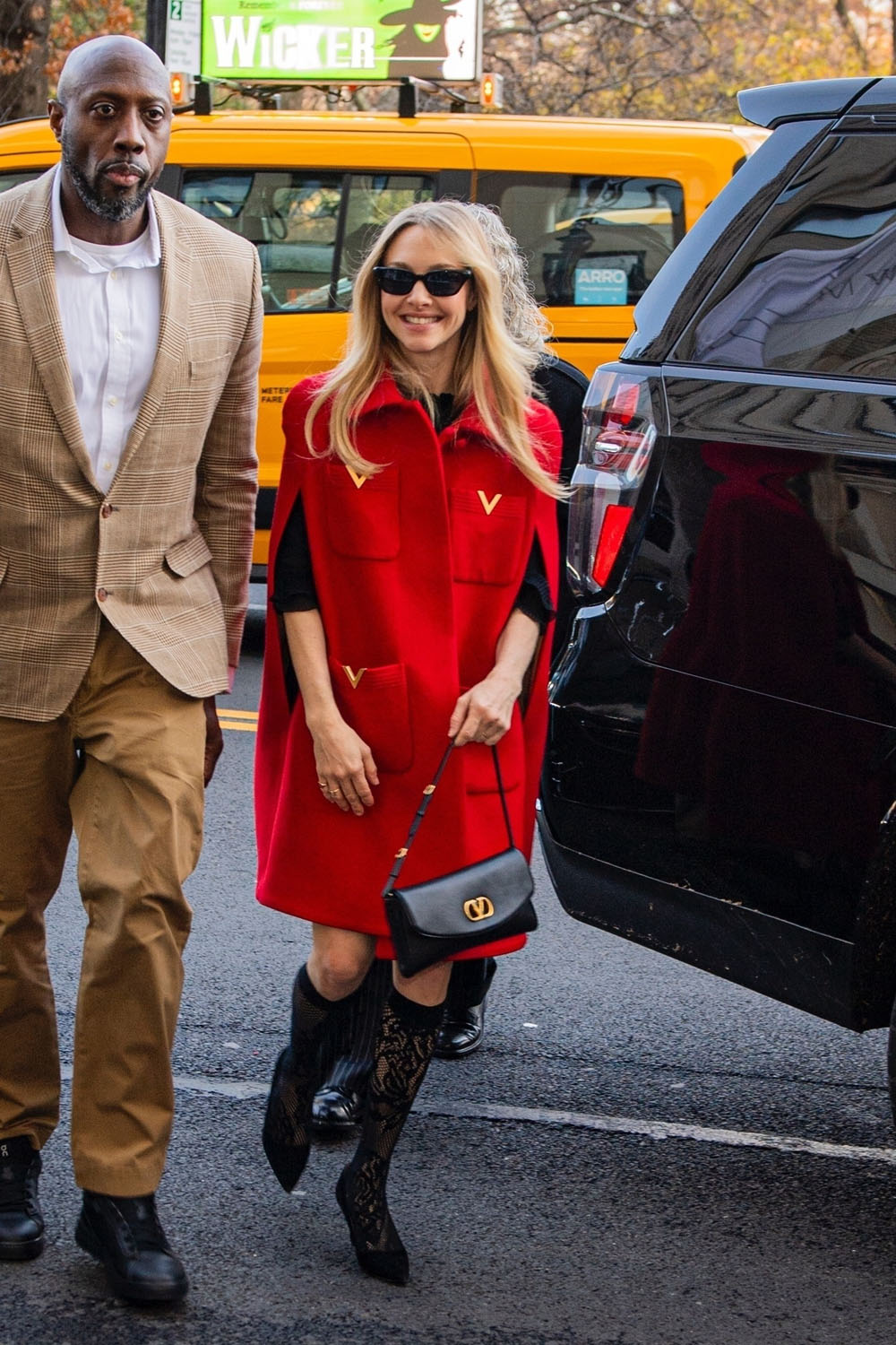 In contrast, Amanda wore a darling red cape-jacket thing. I don’t know what to call this, fashionistas, please advise. But I do love it and want one for my own. One thing I hate about winter is all the layers, it makes it impossible to move sometimes. I end up feeling like the little boy in A Christmas Story who can’t put his arms down.