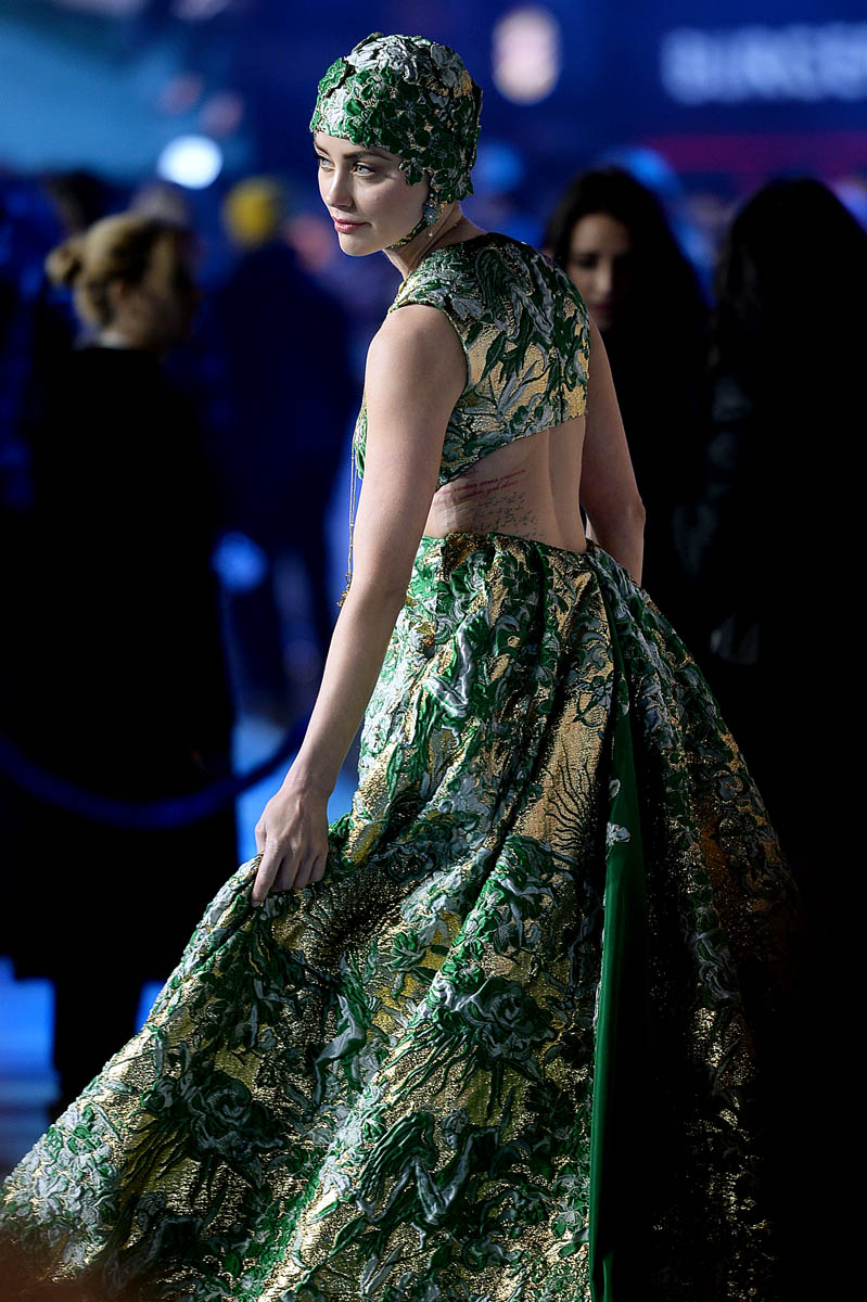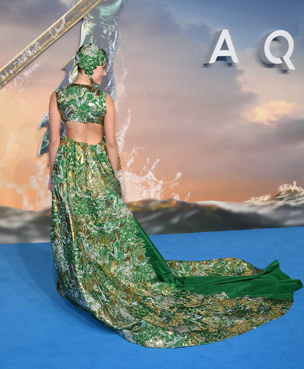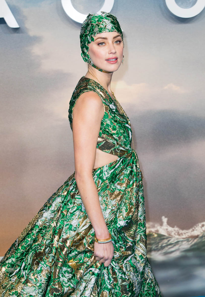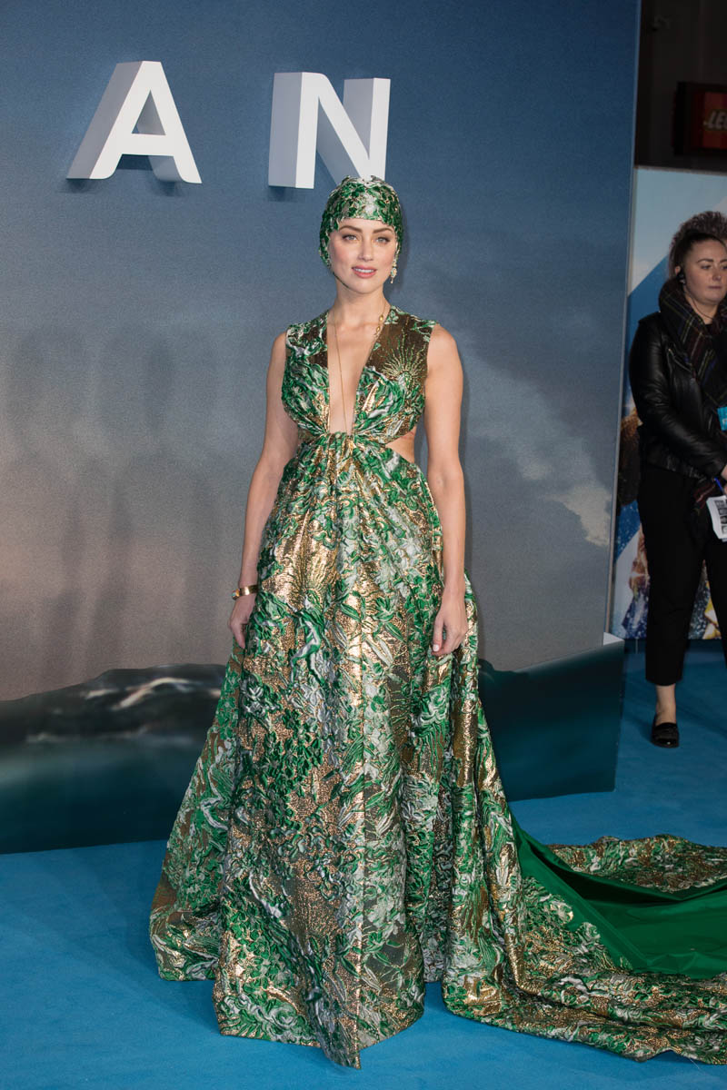 The question is: would Amber Heard have chosen this dress were she not promoting Aquaman. a movie about a superhero who, I think, is the lord of the sea? King of the sea? Monarch of the sea?