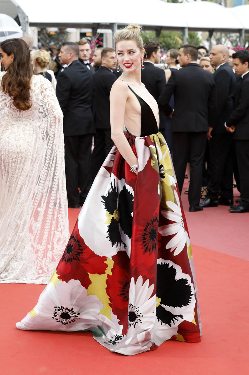 The annual Cannes fashion show is now well underway. Cannes fashion has its own DNA. You don’t go for subtle when you dress for Cannes. The key word is “more”. More sequins, more sparkles, more feathers, more colour, more volume, more everything. Everyone at Cannes is a peacock. So here’s Amber Heard in Valentino last night at the Sorry Angel premiere. The print colours on the skirt even match the colours of her side rib tattoos. This is a glorious look. It’s a perfect gown on her. On her. That’s the point. That’s where I have questions.