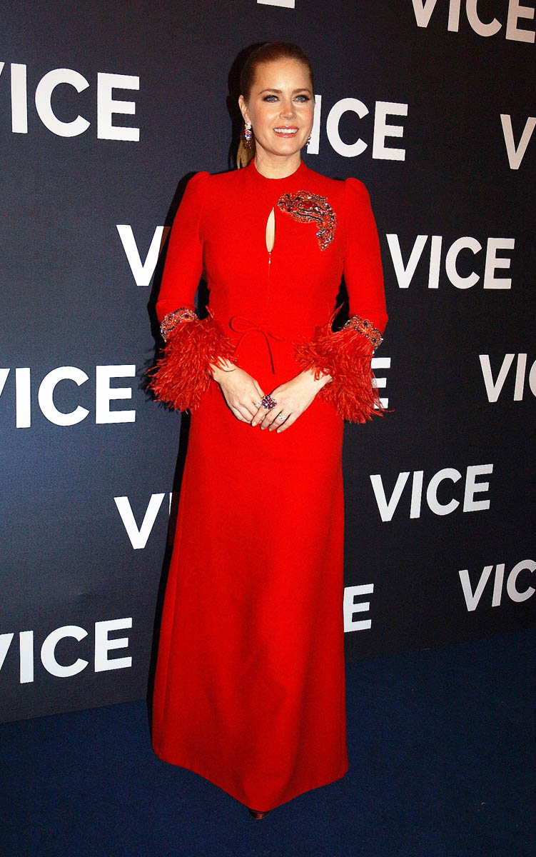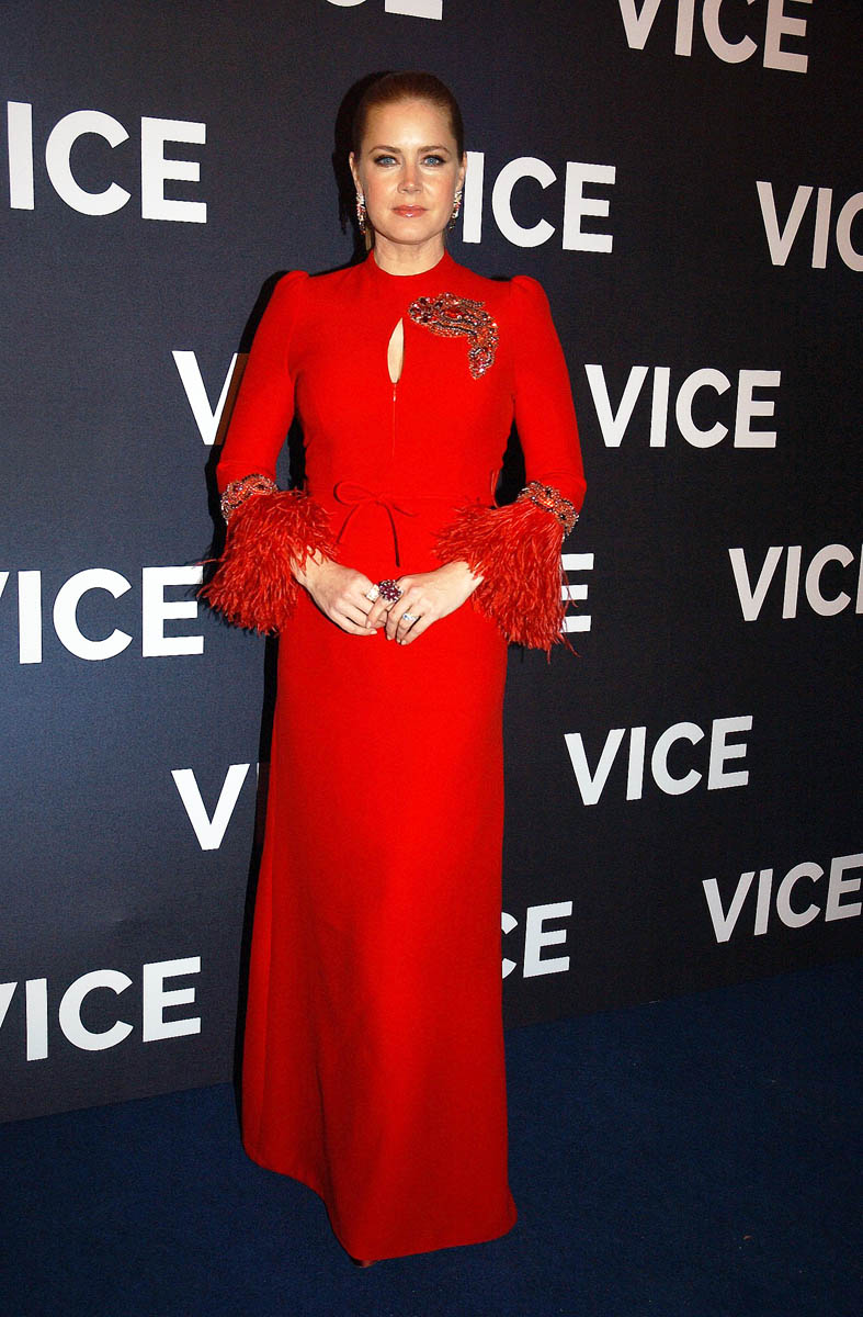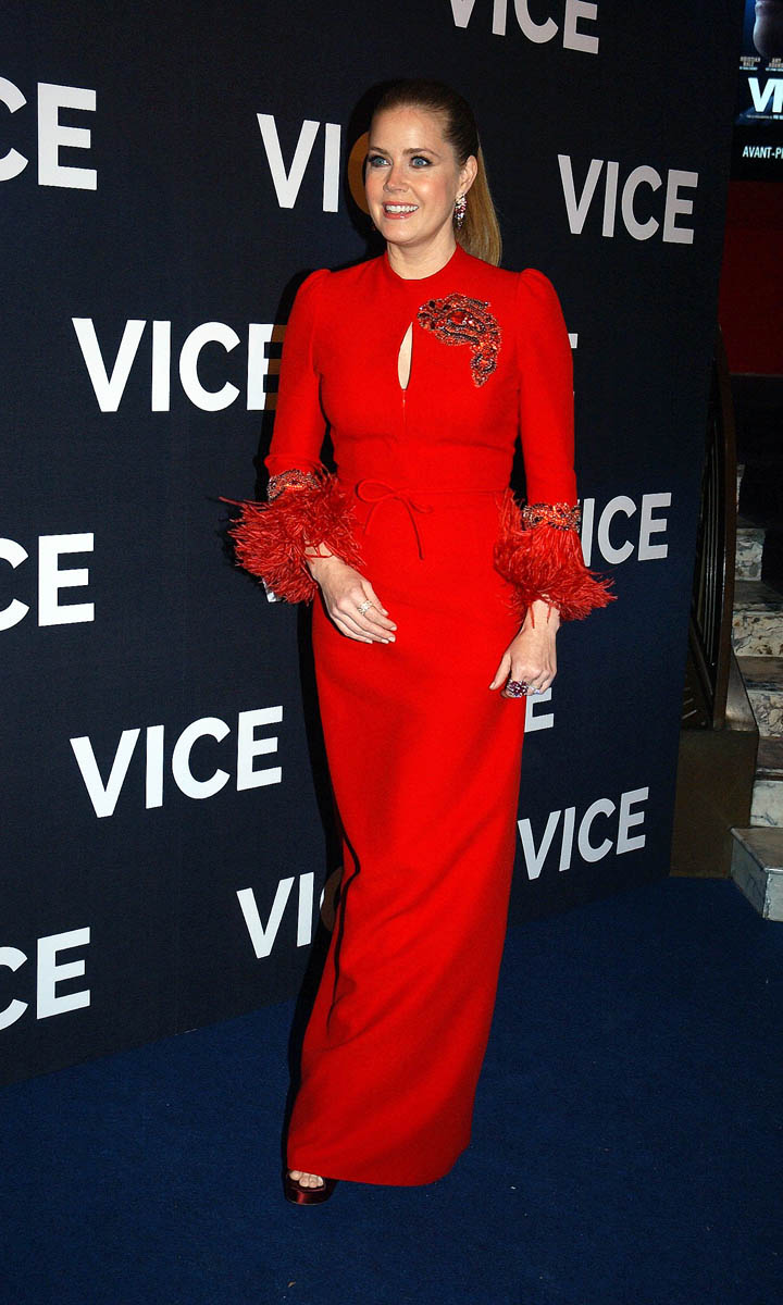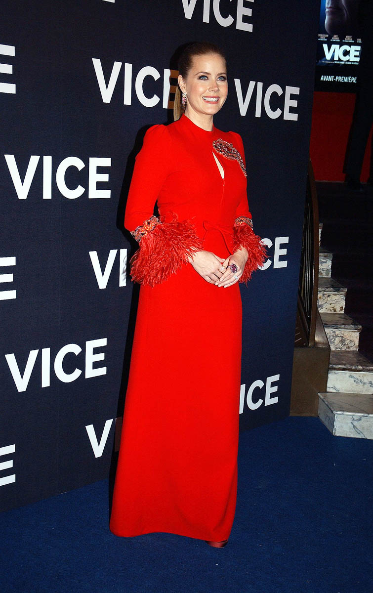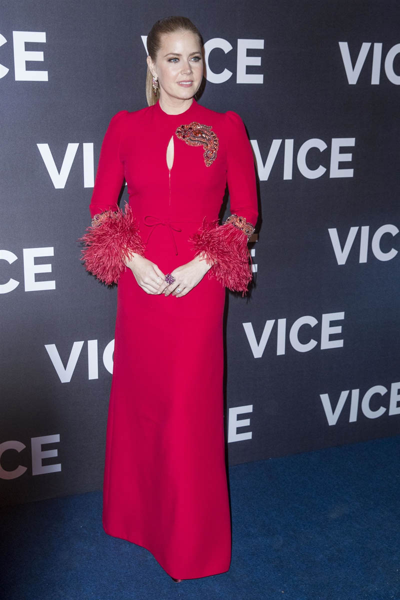 Without a doubt the best red carpet look on Amy Adams this entire award season and it’s not even at an award show. This is Andrew Gn and she looks amazing. I don’t normally vote for a red dress but this one, on Amy Adams, is undeniable. I love the embellishment over the heart (that’s a little bit Gucci-inspired, which is why at first I thought this was Gucci), and the judicious use of feathers at the sleeve, it fits her perfectly, and the hair choice is great.