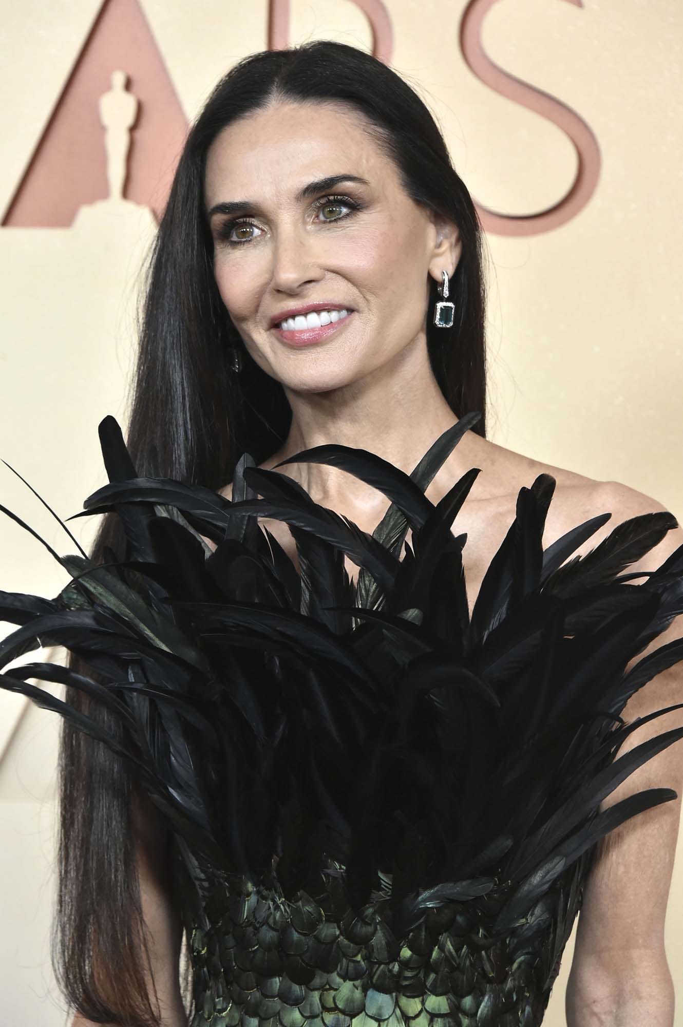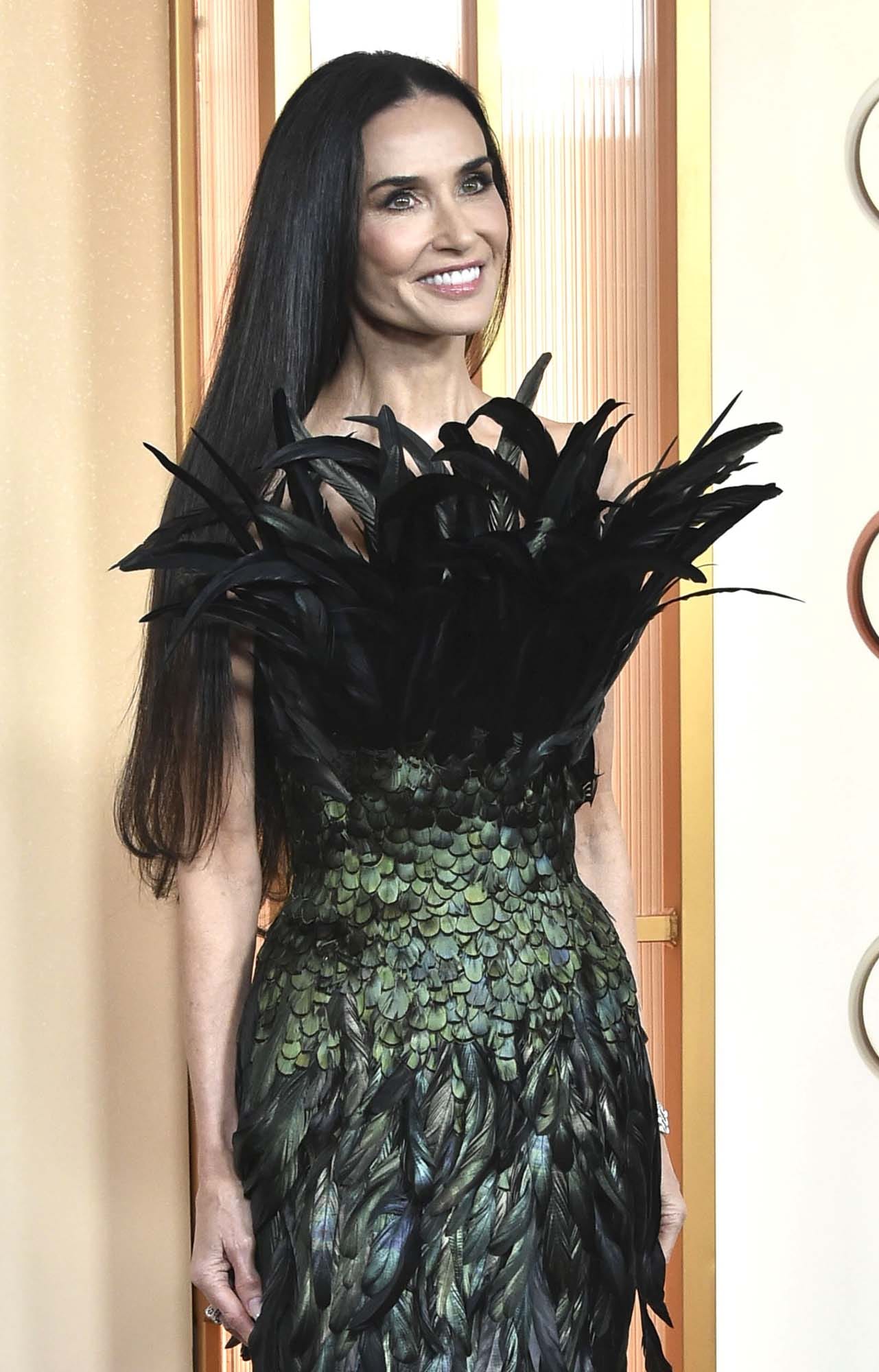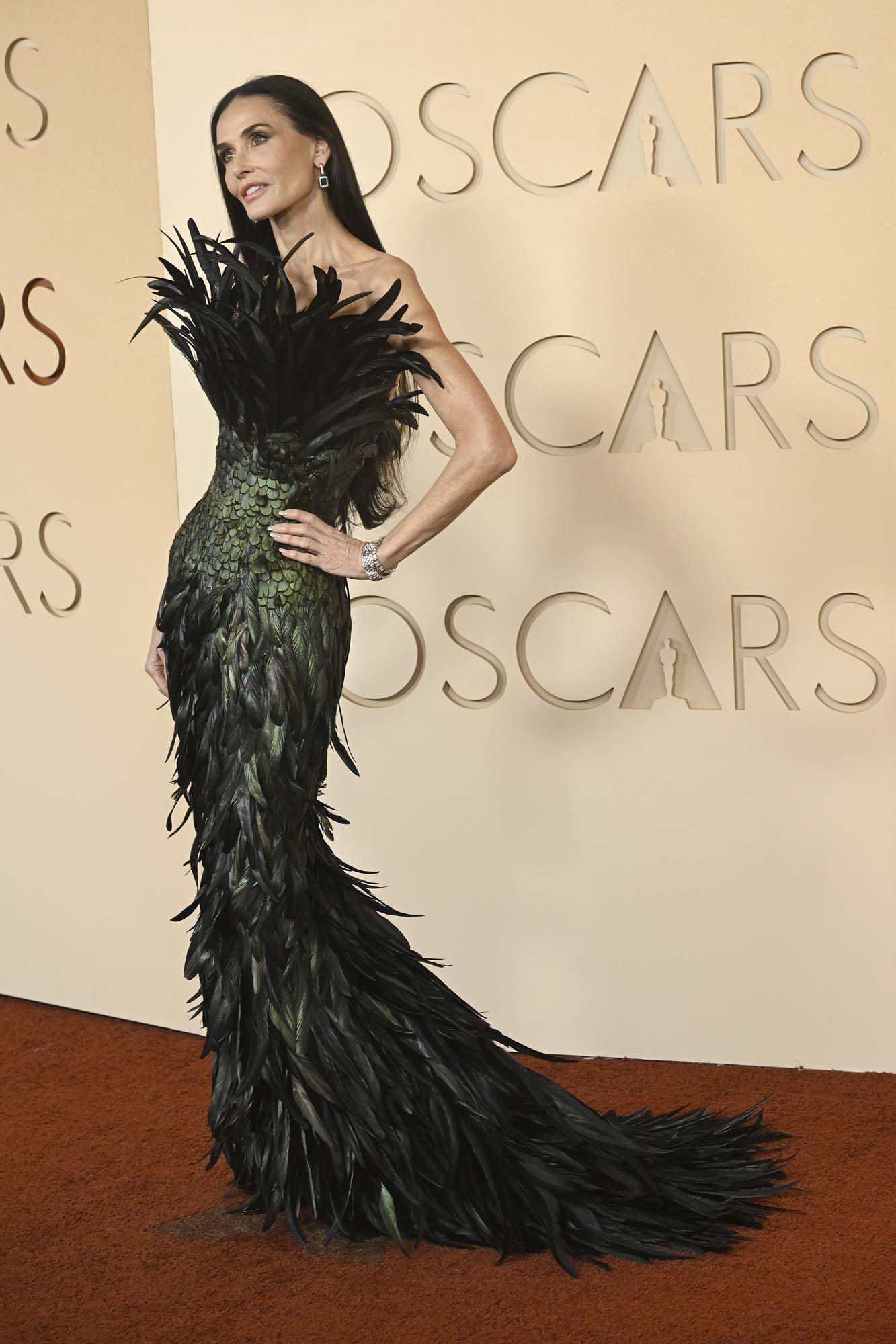 Then there’s Demi Moore, in the most feather of all the feather looks, a custom Gucci by Demna that is a relative of one of the most beloved award season dresses of the last 20 years – can you see the DNA?