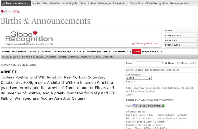 LOVE the name Archie! LOVE Will Arnett and Amy Poehler! LOVE their low key but very elegant birth announcement the other day in the Globe & Mail, Canada’s oldest national daily paper – thanks Julia for sending!