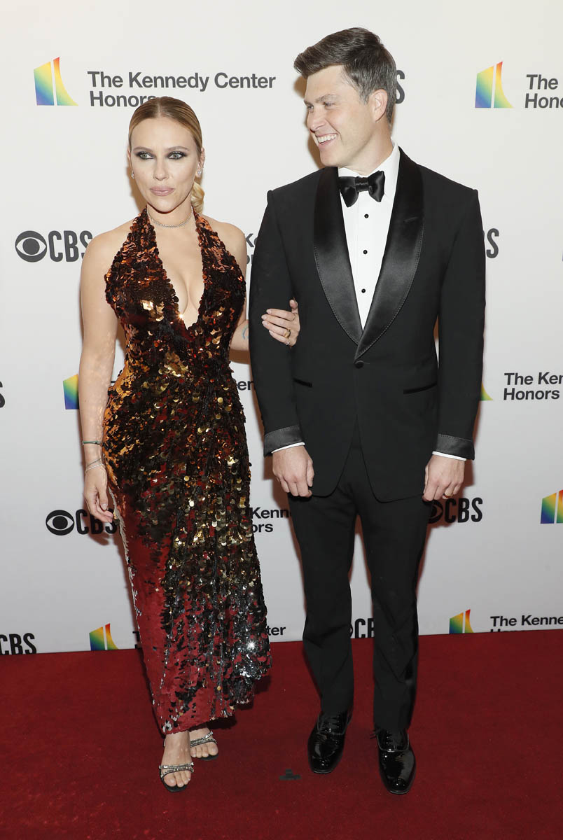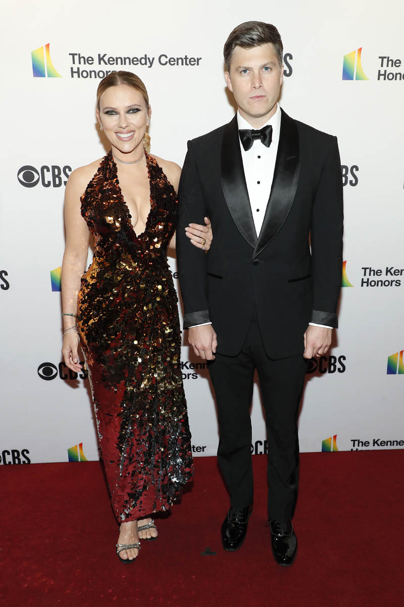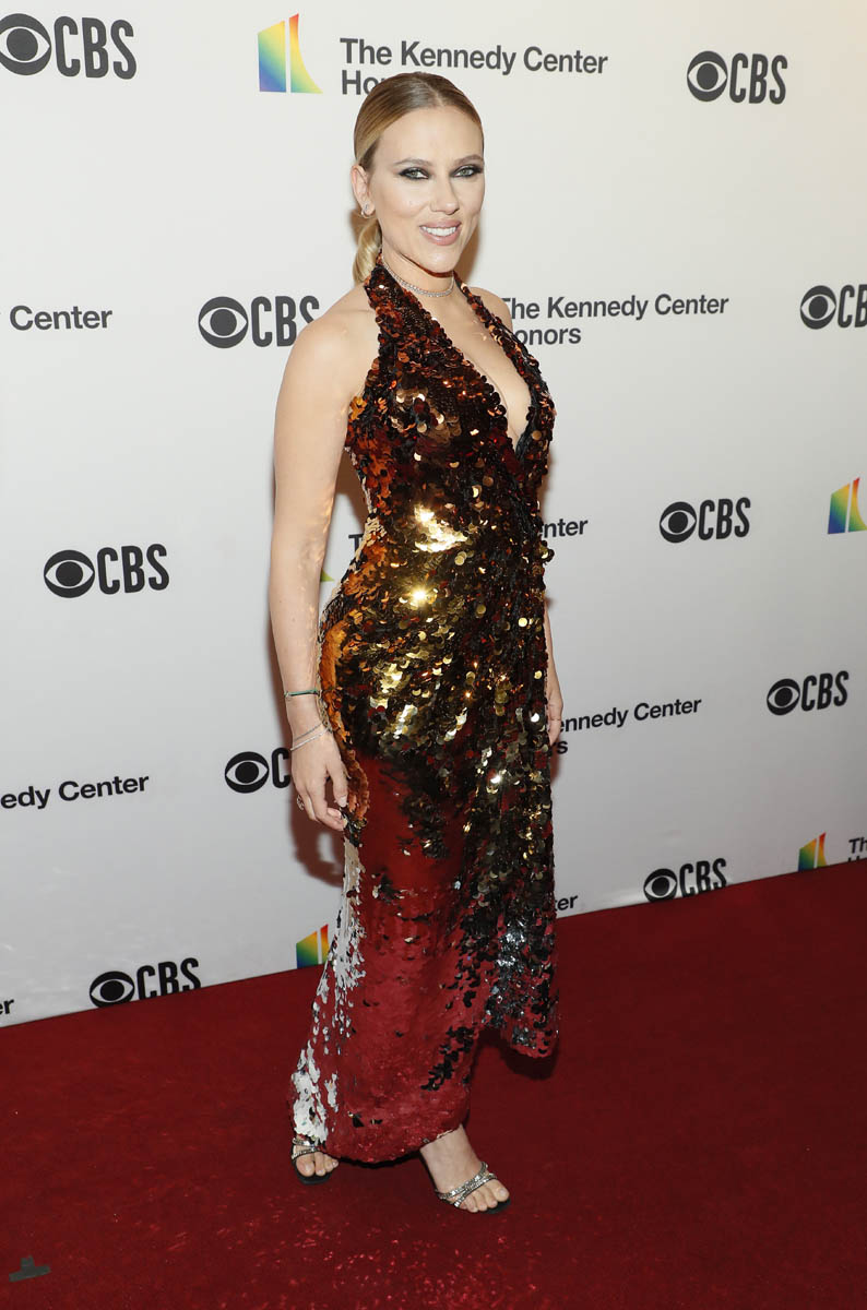 Here’s Scarlett though at the Kennedy Center Honours this weekend with Colin Jost. Officially, at this event, on this occasion, she would have been his plus one, since Lorne Michaels was one of the recipients and that connects to him. Then again, Scarlett is a member of SNL’s Five Timers Club because she’s among the small cohort of celebrities who has hosted at least five times, which means she’s an SNL favourite – aka she’s a Lorne favourite. And if her outfit is any indication, she holds Lorne in high regard because this is a pretty great dress: gold almost orange mid-size sequins, fitted, and plunging. A look that’s worth all the sequin-scratching against the skin. That’s the thing about sequins of any size but particularly the larger ones, at least in my experience – they are not kind on your body, you can feel it with every movement.