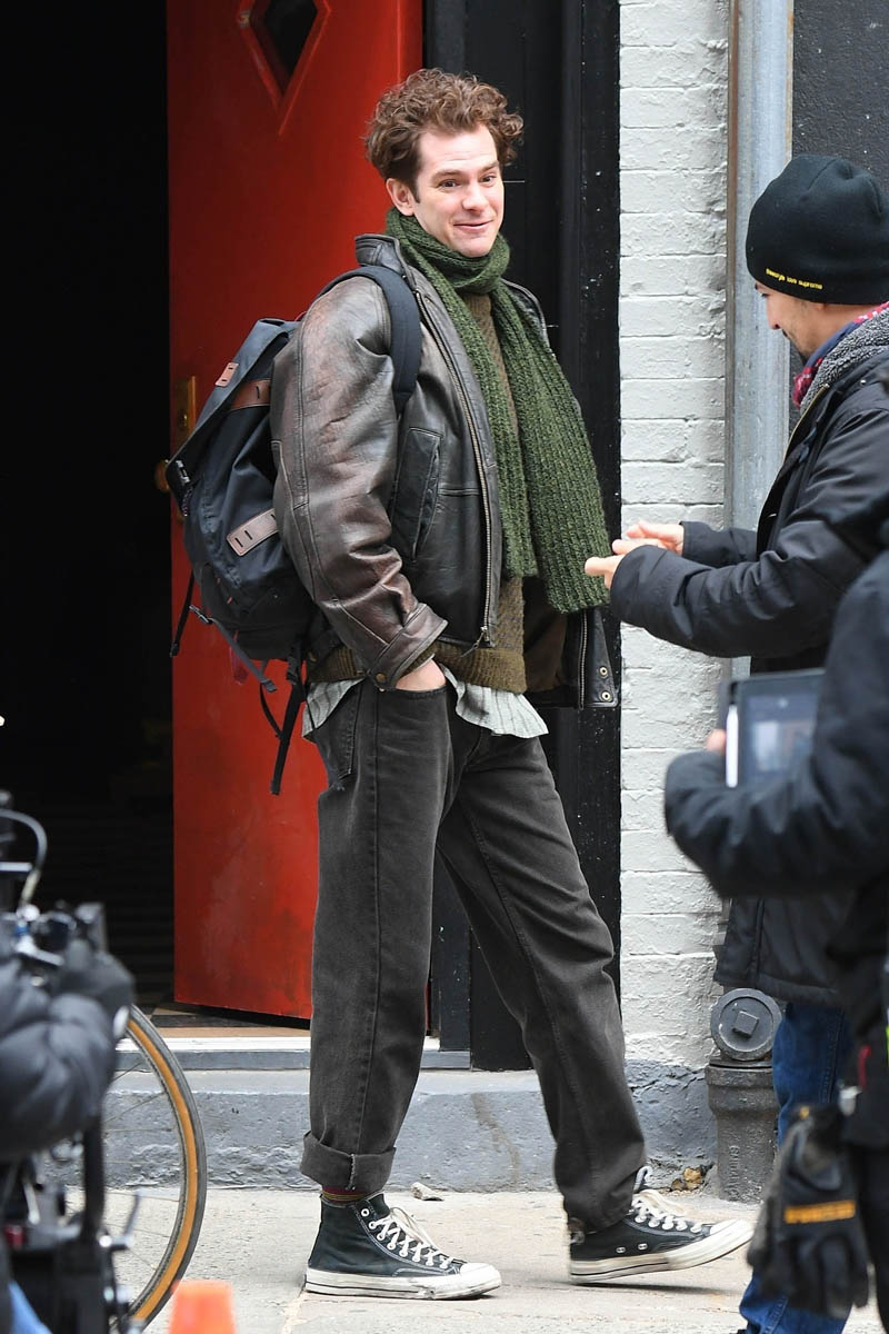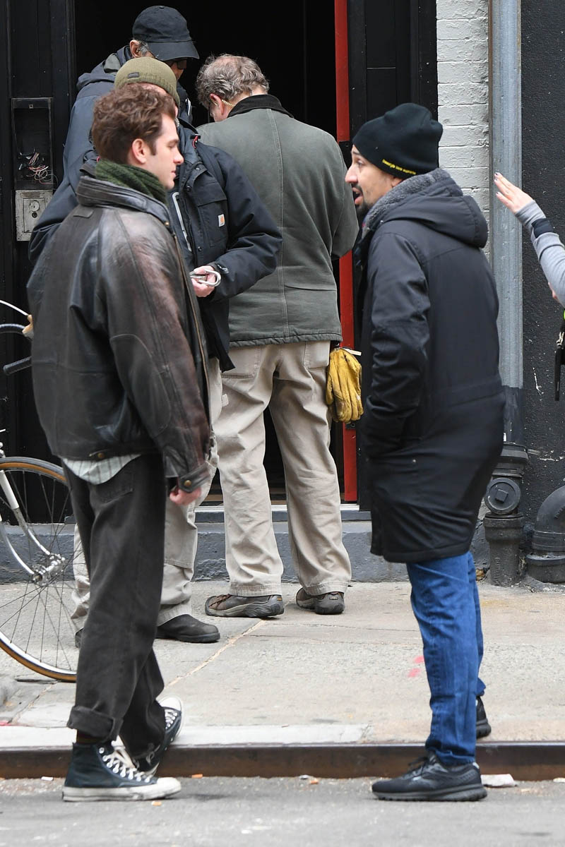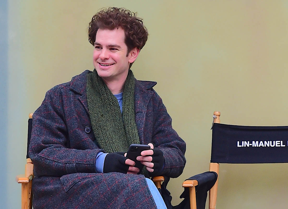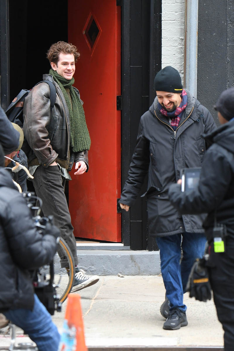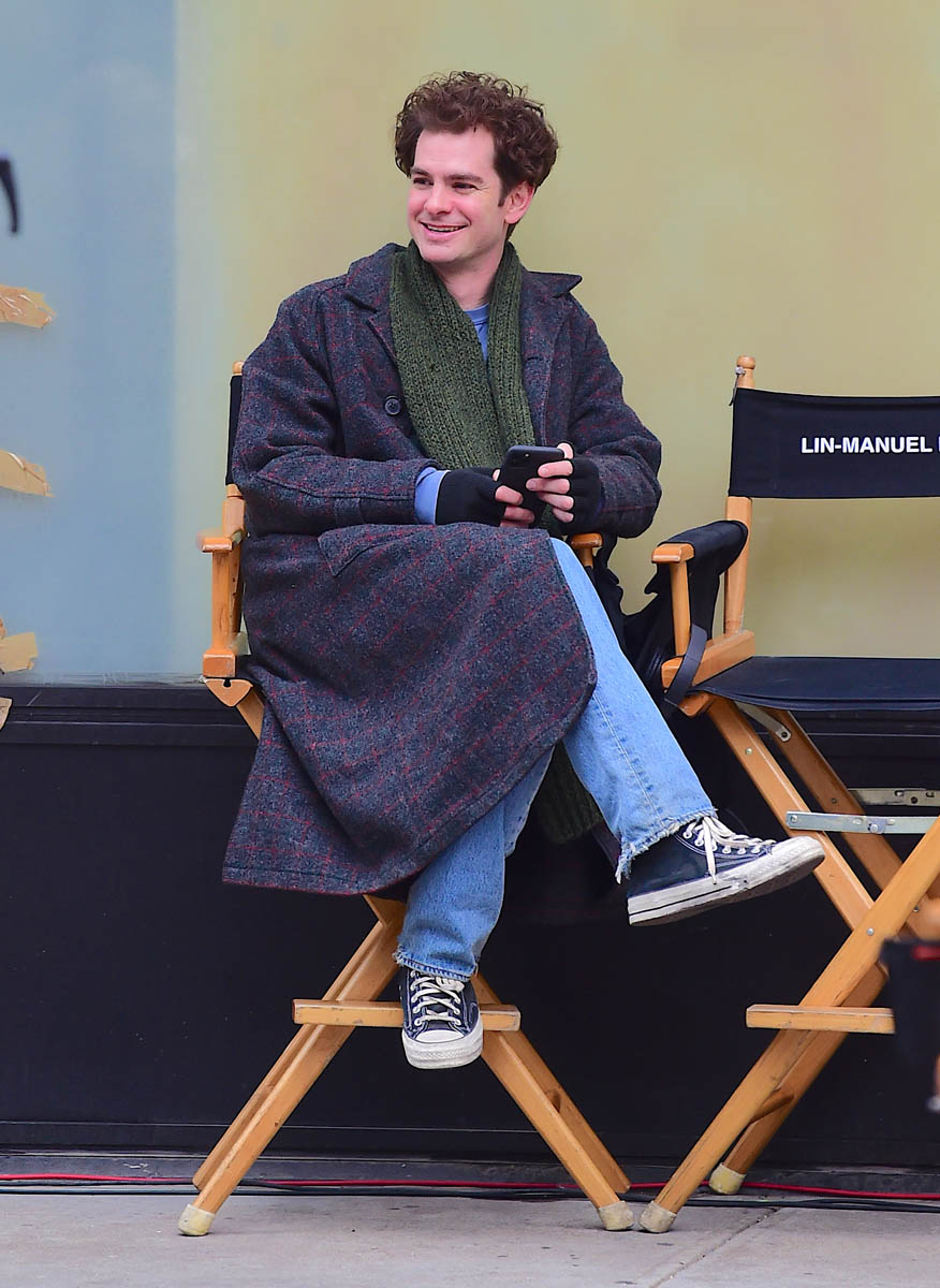 There is a project that, as of yesterday, was still underway – Lin-Manuel Miranda’s Tick, Tick…Boom! is still filming in New York. Here’s a shot of Andrew Garfield on set yesterday. He looks relaxed as he’s chatting with a crew member.