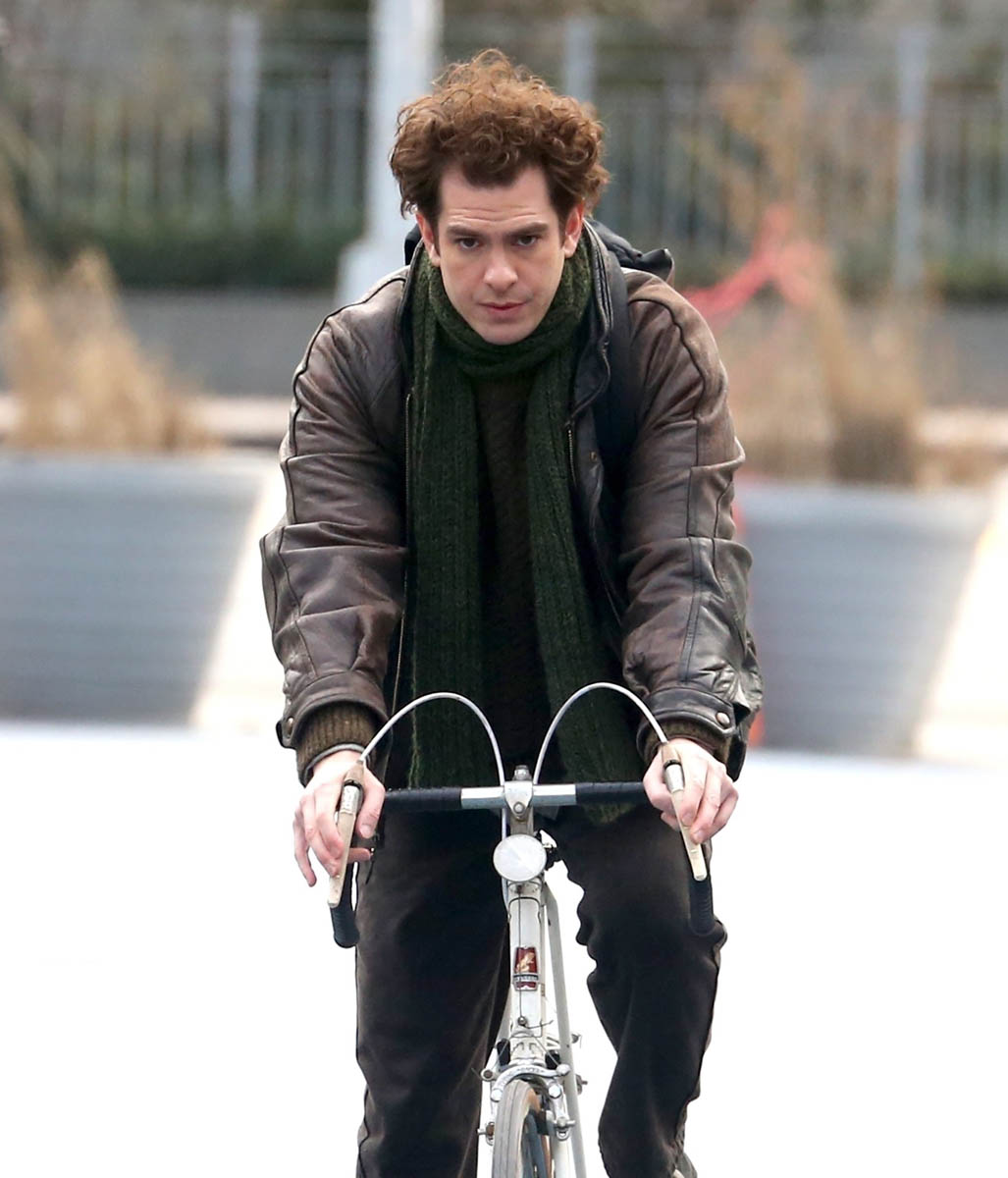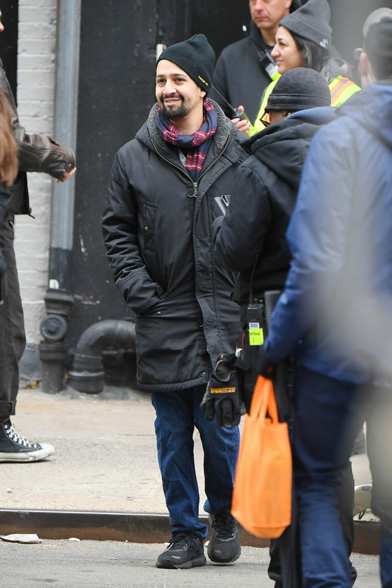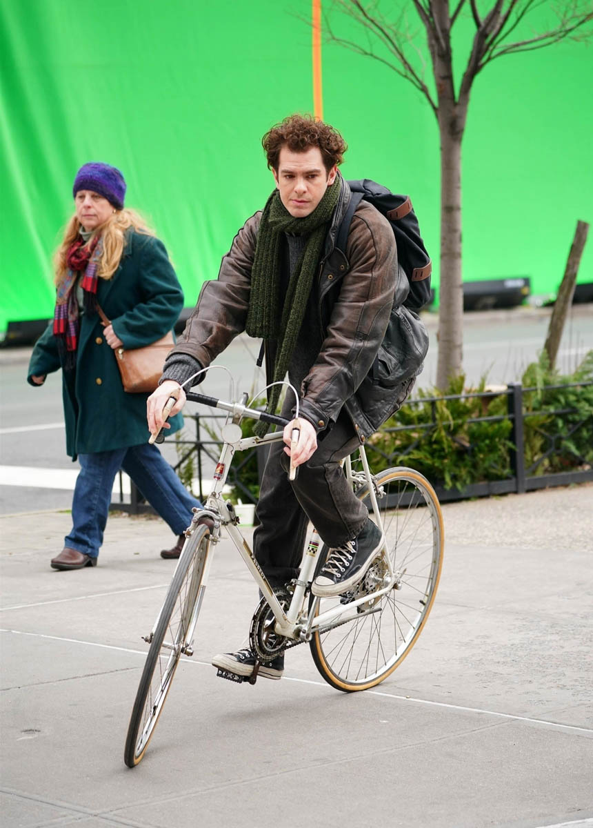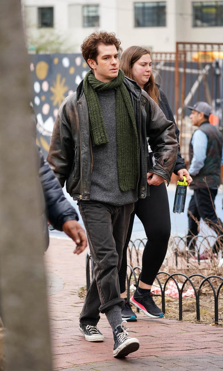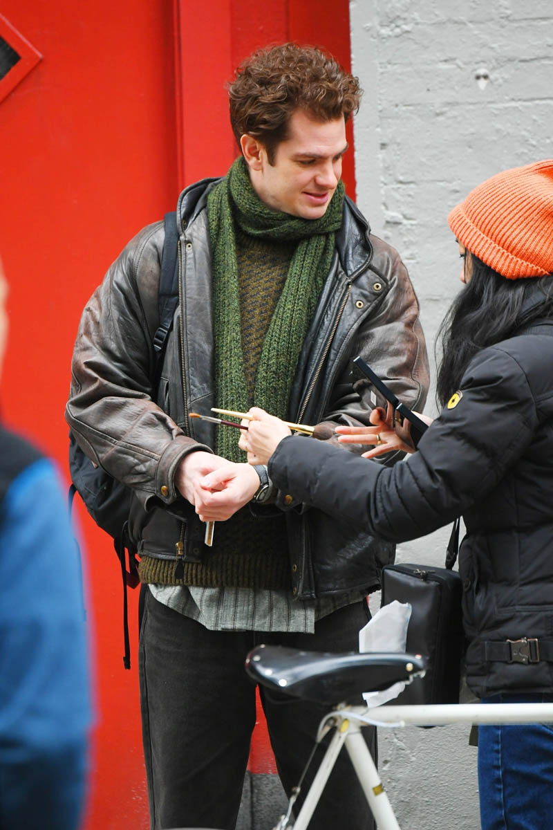 There is a project that, as of yesterday, was still underway – Lin-Manuel Miranda’s Tick, Tick…Boom! is still filming in New York. Here’s a shot of Andrew Garfield on set yesterday. He looks relaxed as he’s chatting with a crew member.