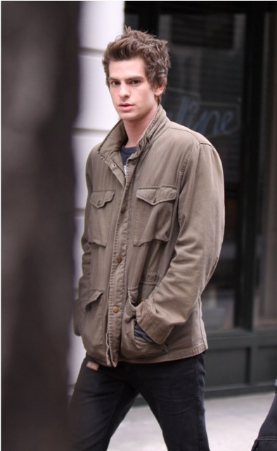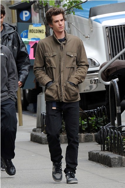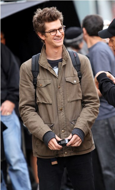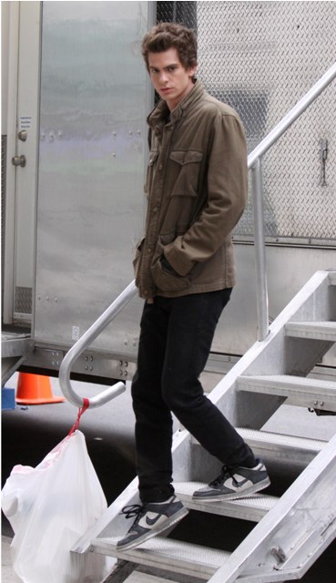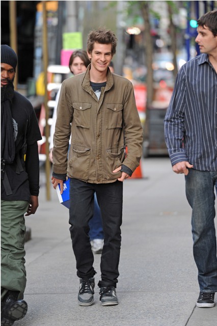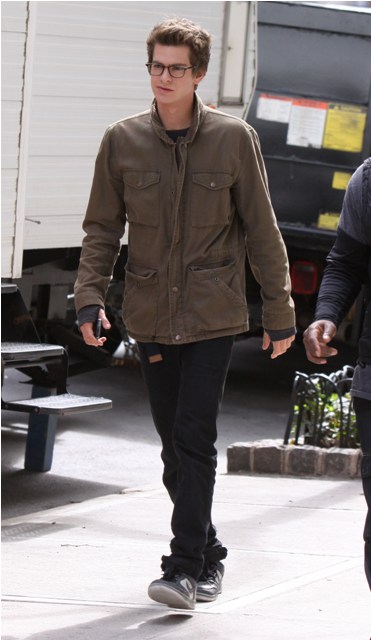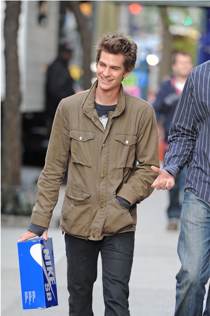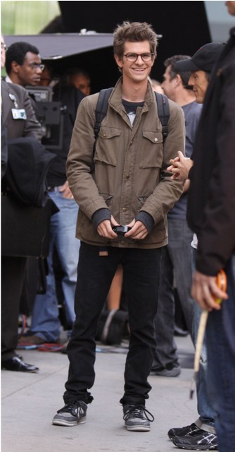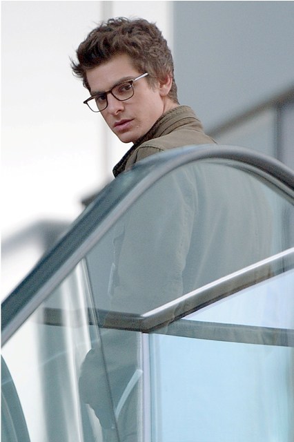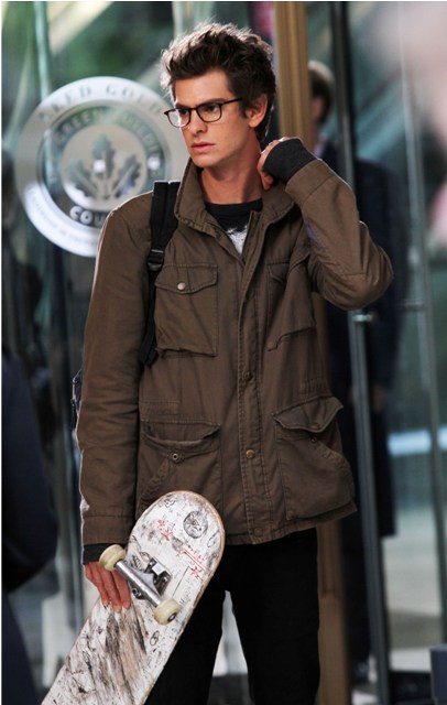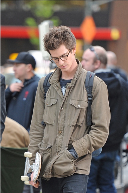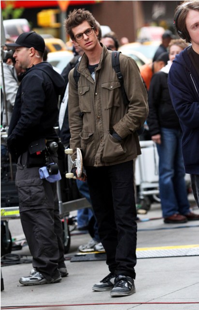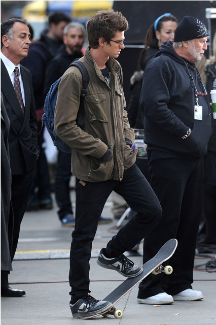 Am very attracted to Andrew Garfield in these shots of him in New York shooting Spider-Man this weekend. I like the way he looks in those glasses. I like the way he’s wearing his pants. I like the way he’s working that skateboard. I like his hair, I like his gait, I like it all. Very encouraging.