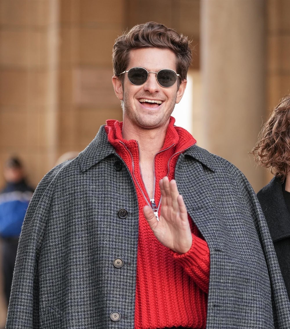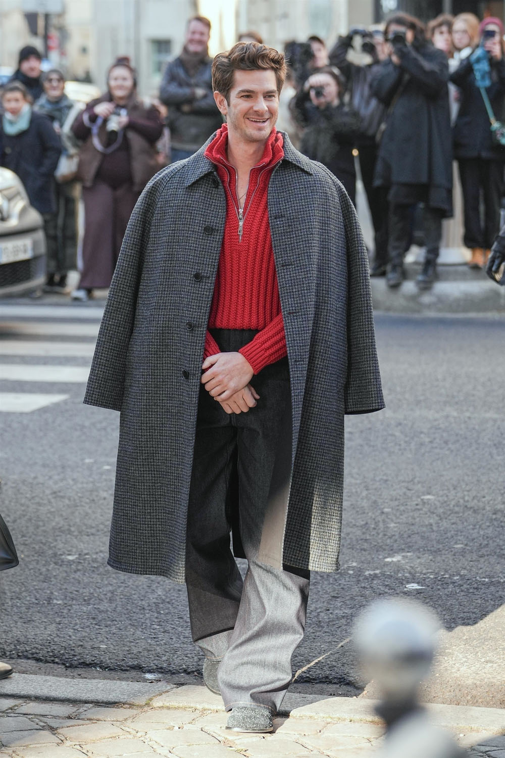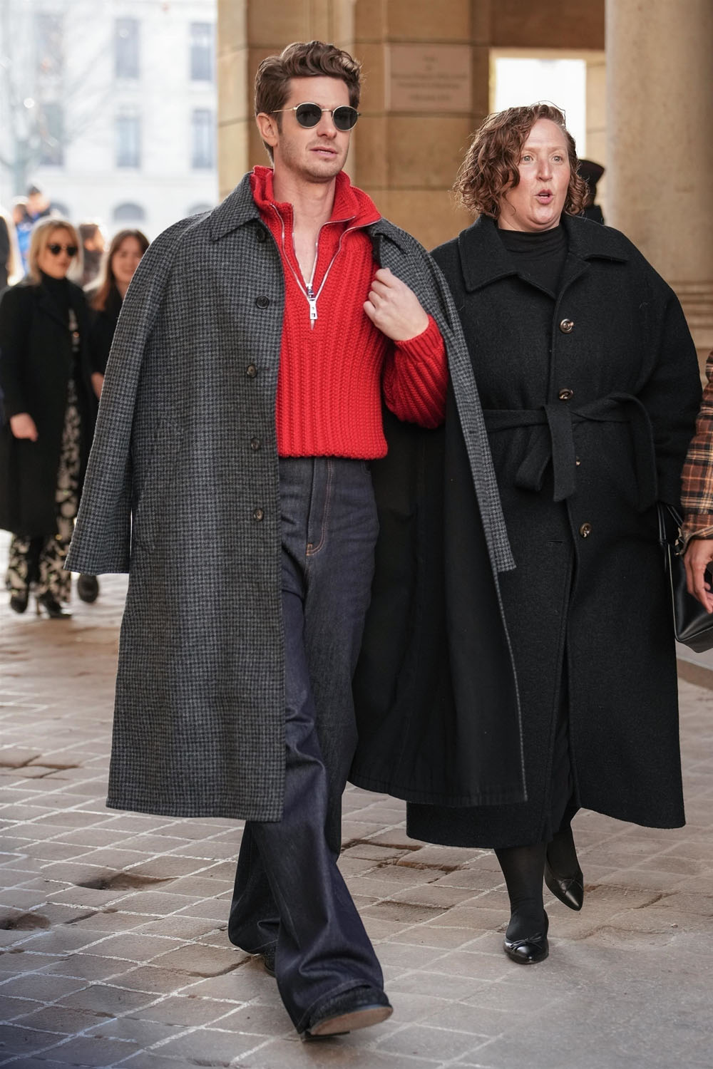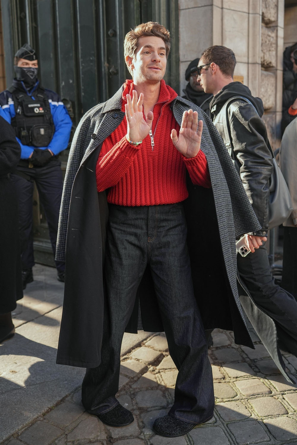 We’ll start in Paris at the Loewe show where Andrew rocked up looking excellent in a red sweater with a coat thrown stylishly around his shoulders. Andrew had a pretty light schedule after wrapping on We Live in Time with Florence Pugh during the first part of 2023. There was the strike, of course, but he hasn’t been on set since that ended. That’s not to say he doesn’t have projects in development but he did say after the award season run of tick, tick…BOOM! that he needed a break. And for the most part he seems to be sticking to that.