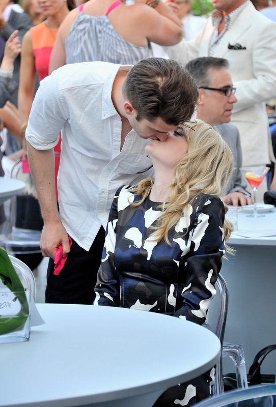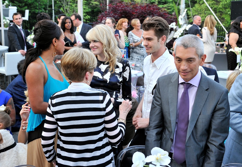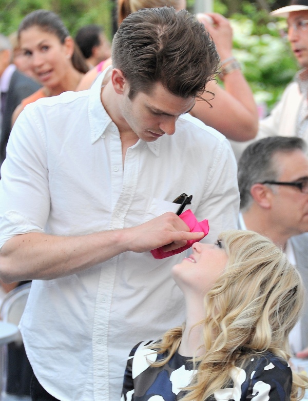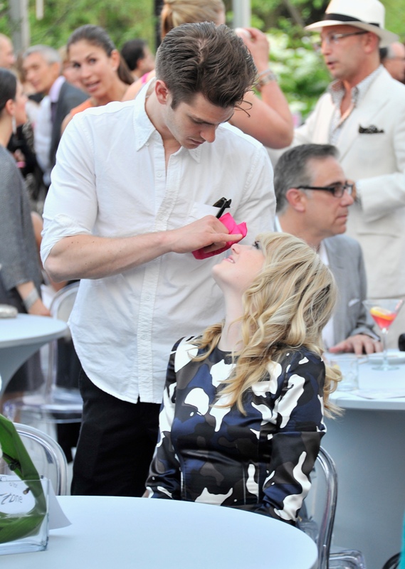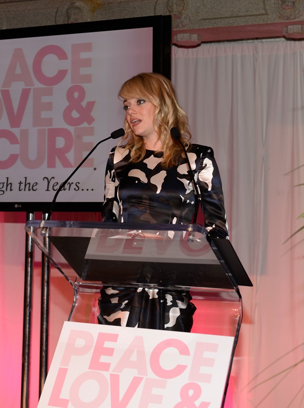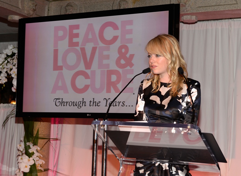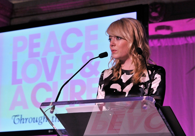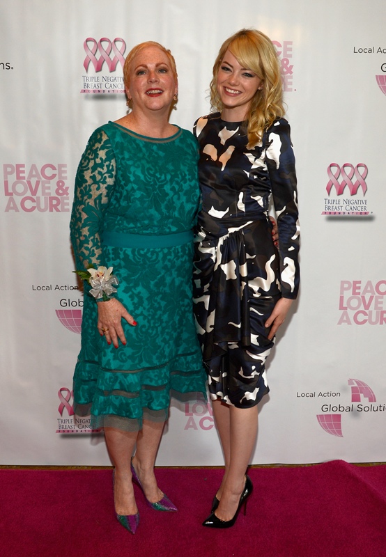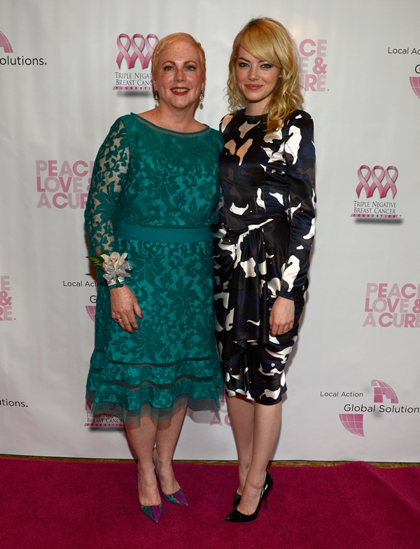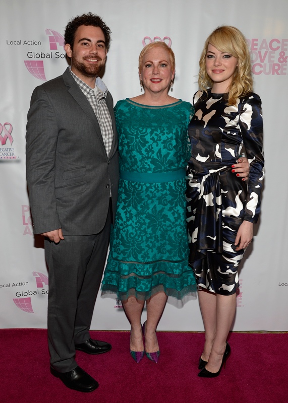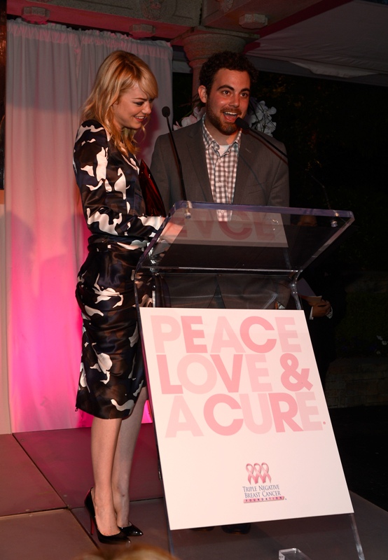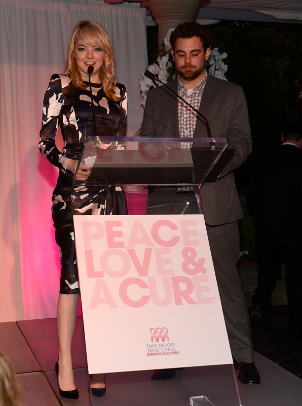 Emma spoke at the Peace, Love & A Cure Triple Negative Breast Cancer Foundation benefit yesterday in New Jersey. She was joined by her mother Krista, who is a breast cancer survivor, and her brother Spencer. Also, Andrew Garfield. Who kissed her at the event and appears to be tenderly rubbing something off her face.